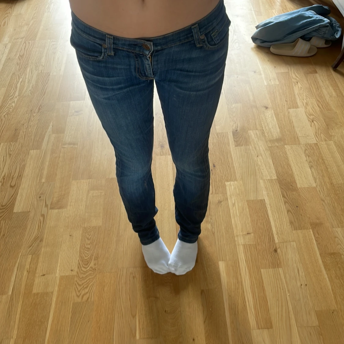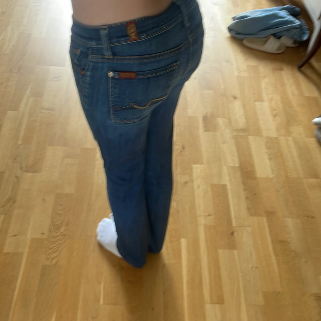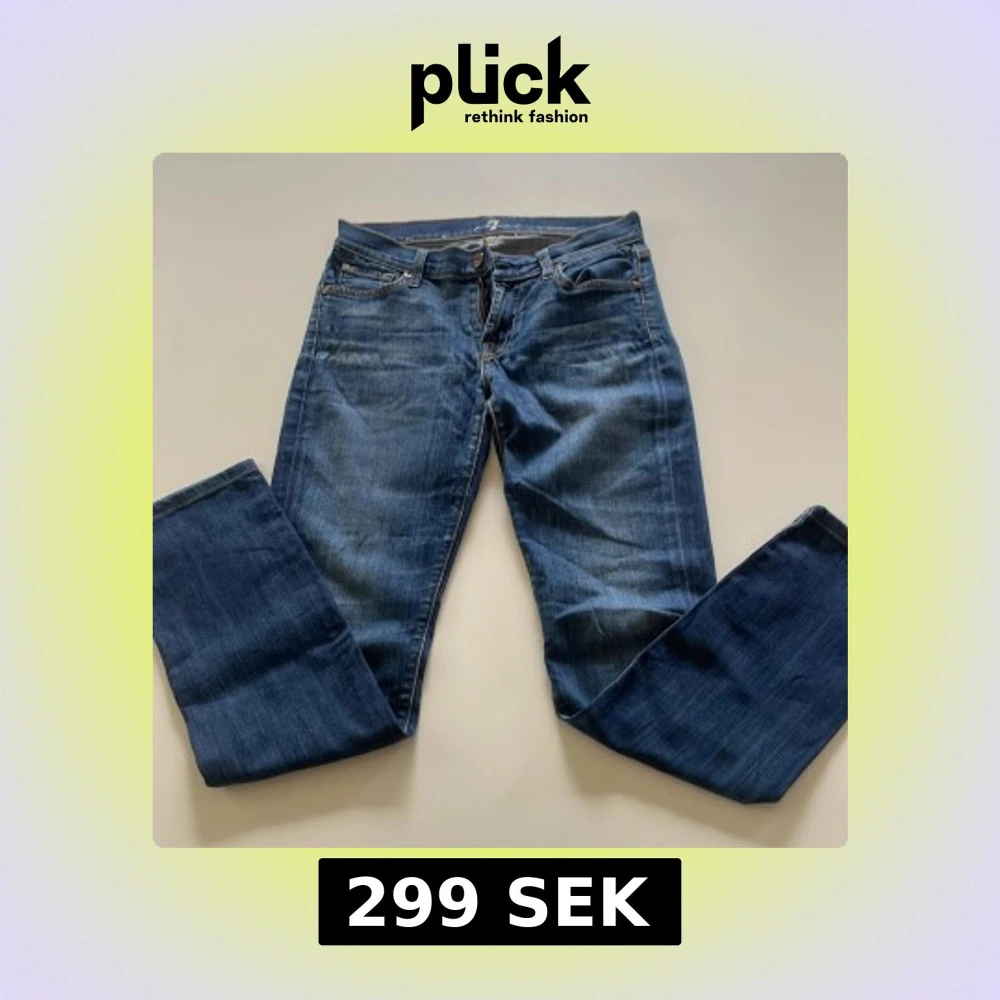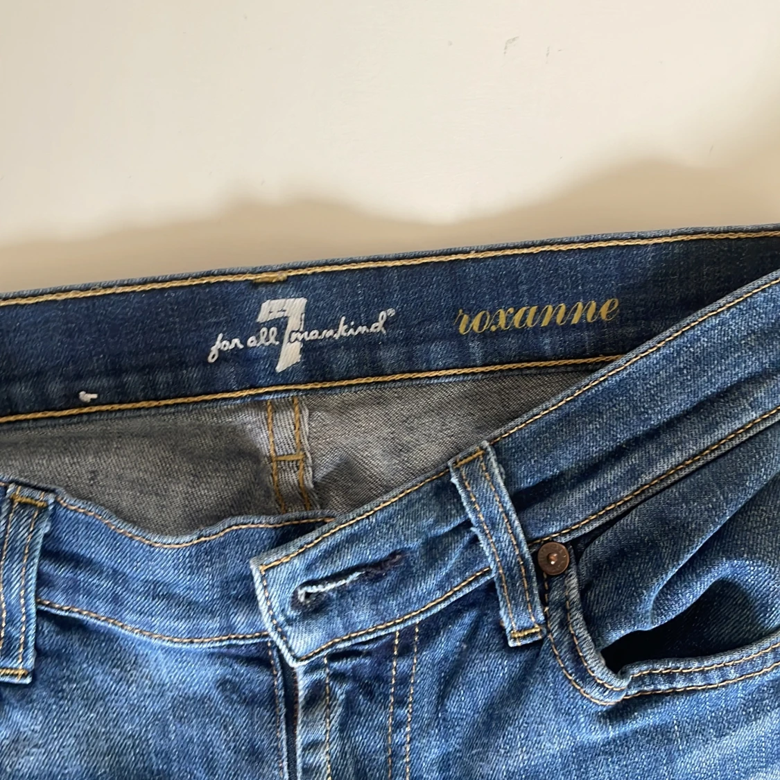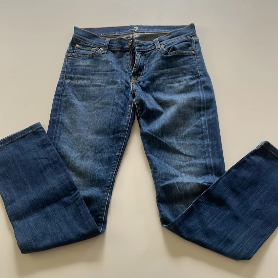 Snygga blå jeans från 7 For All Mankind med klassisk femficksdesign och gul broderad detalj på bakfickorna. Jeansen har låg midja och en rak passform som sitter tight upptill och släpper vid benen. Tillverkade i mjukt denimtyg med lätt tvättad look.