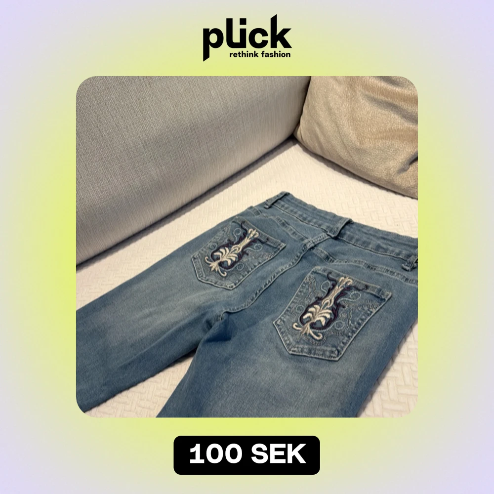 Säljer ett par snygga blå jeans med unika broderade detaljer på bakfickorna. De har en klassisk femficksdesign och en bekväm passform. Perfekta för både vardag och fest! 🦋