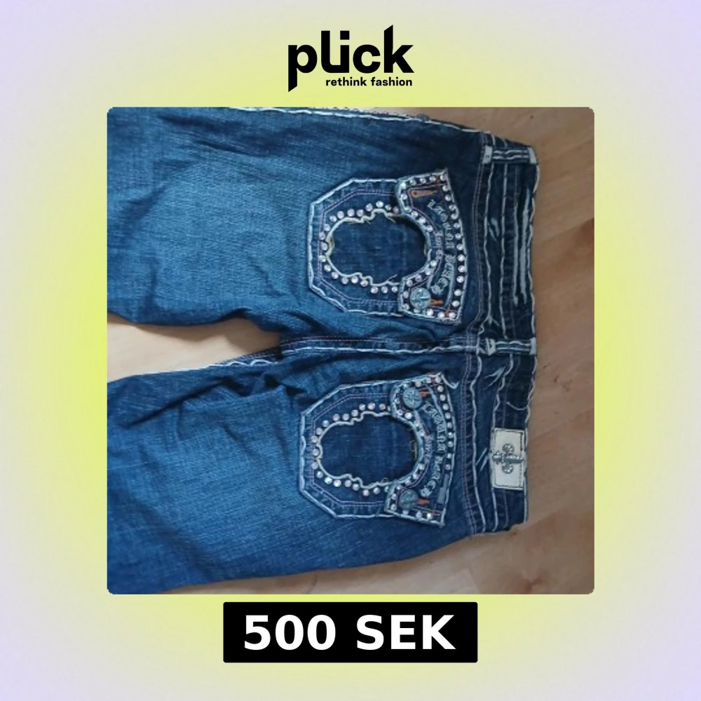 Säljer ett par blå jeans med unika, dekorerade bakfickor med nitar och broderier. Jeansen har normal passform och klassisk femficksdesign. Perfekta för dig som vill sticka ut med detaljer på dina byxor.