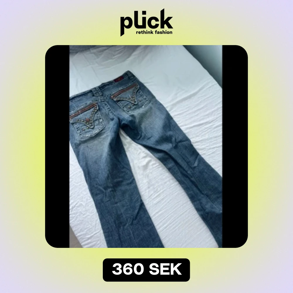 Säljer ett par as snygga blå jeans med coola detaljer på bakfickorna. Köpte dom här på Plick men var tyvärr försmå på mig så därför säljer jag nu vidare. Jag är också öppen för byte om någon har några liknande. Mått: midja-81 innerben-81 längd-105🤗