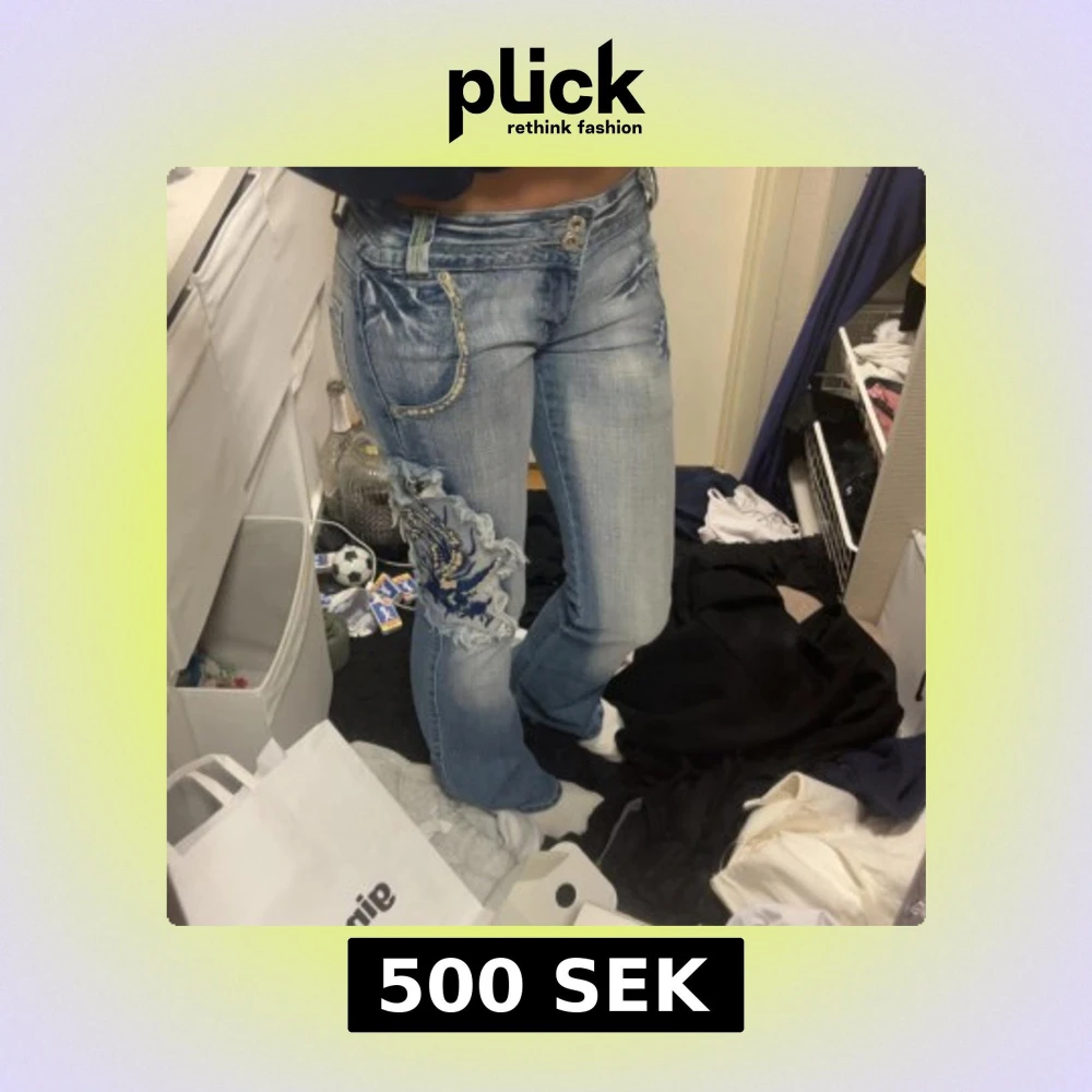 Unika ljusblå jeans från Provog med coola slitningar och broderad drakpatch på ena benet samt färgglad patch på bakfickan. Säljer pågrund av att de inte kommer till användning längre. Jeansen är i storlek S men kan också passa de som är i storlek XS. Pris kan diskuteras!