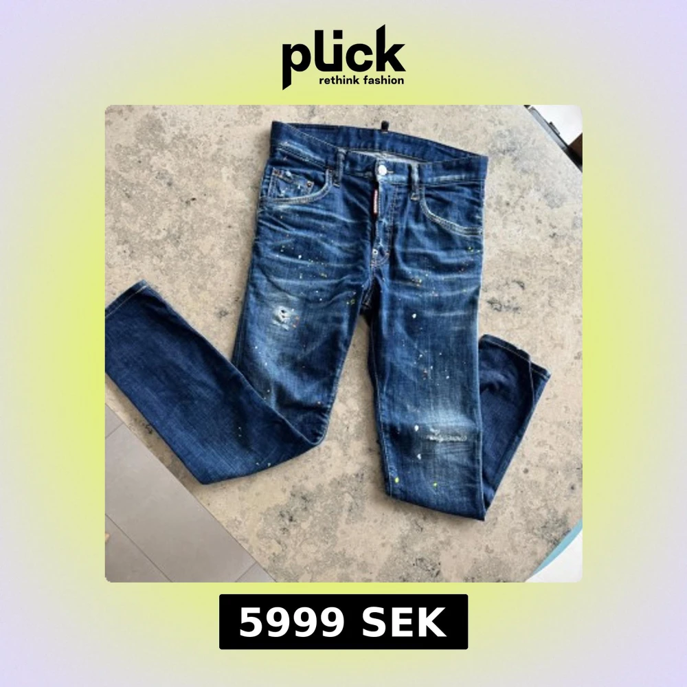Snygga blå jeans från Dsquared2 med unika färgstänk och slitna detaljer. De har en klassisk femficksdesign och knappgylf. Perfekta för en trendig och avslappnad stil.