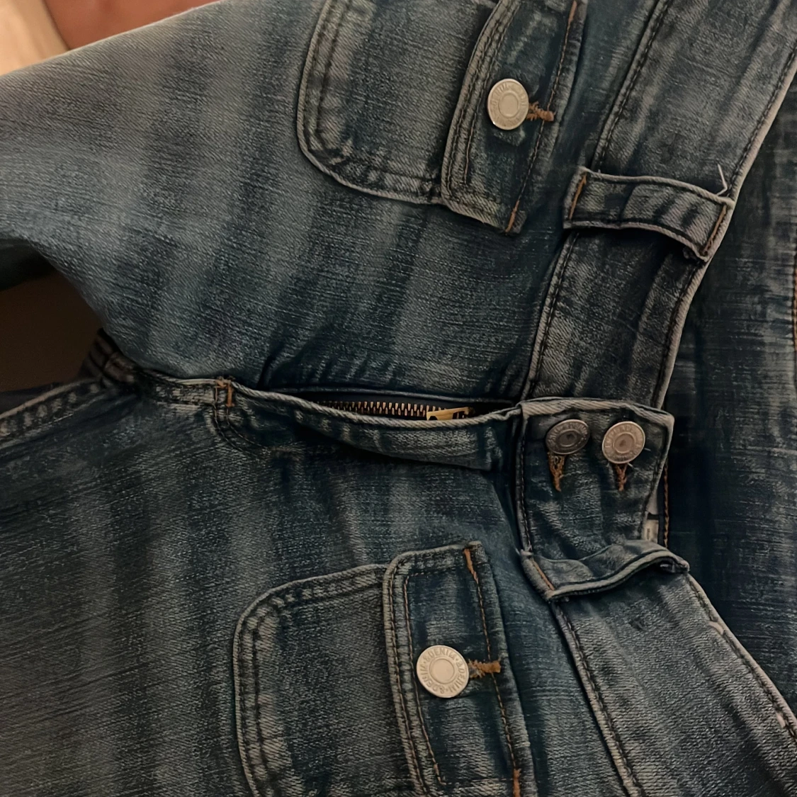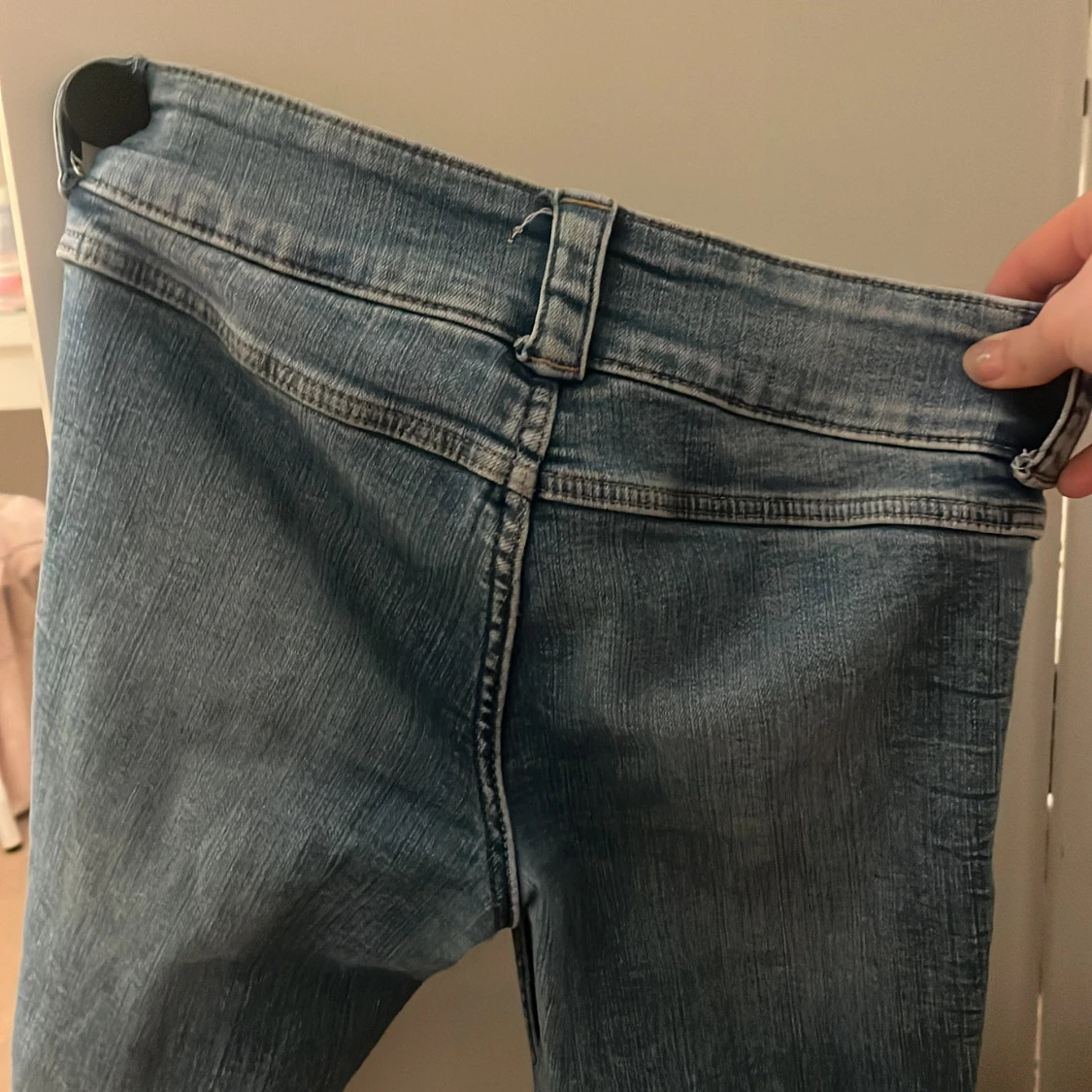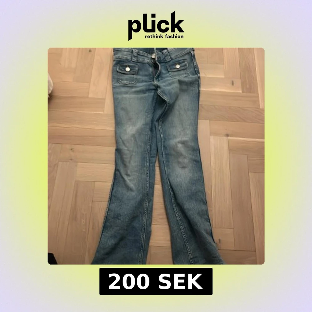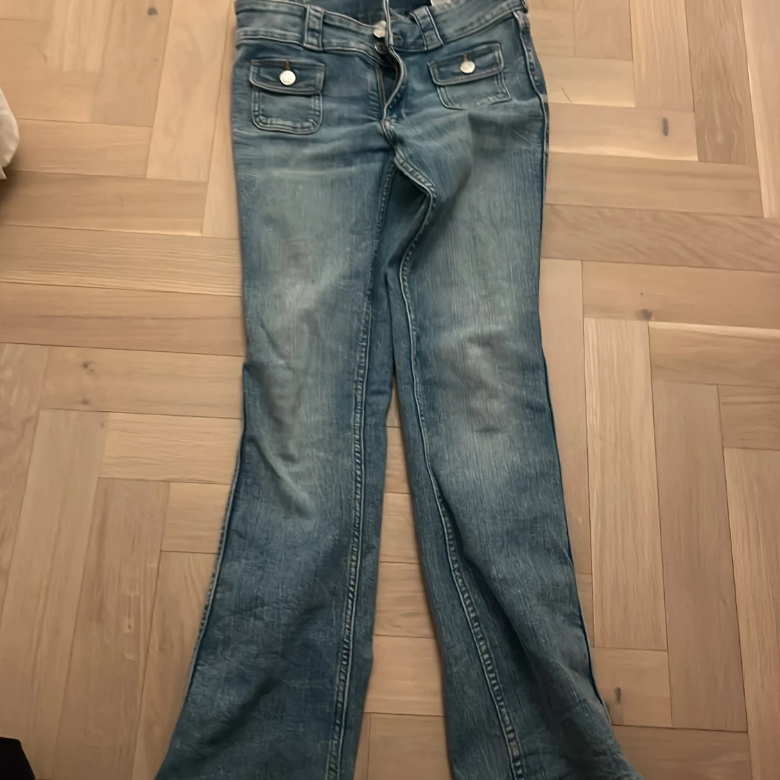 Snygga blå jeans med framträdande fickor och knappar. De har en dragkedja och bälteshällor, vilket gör dem praktiska och stilrena.