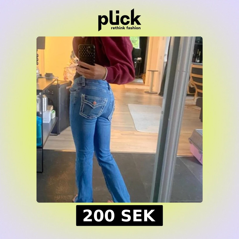 Säljer ett par blå jeans med snygga kontrastsömmar och fickor med lock bak. Jeansen har hög midja och raka ben, vilket ger en klassisk och clean look. Perfekta för dig som gillar en tidlös stil med lite edge.