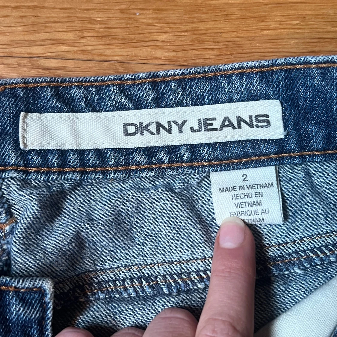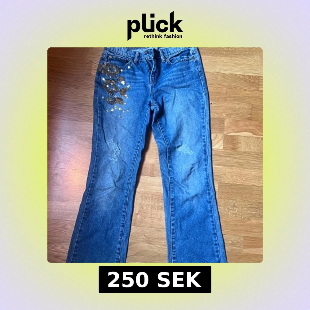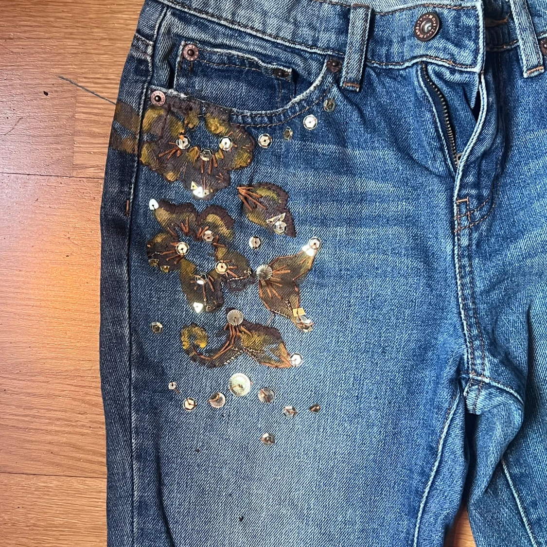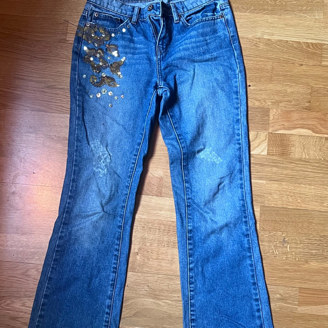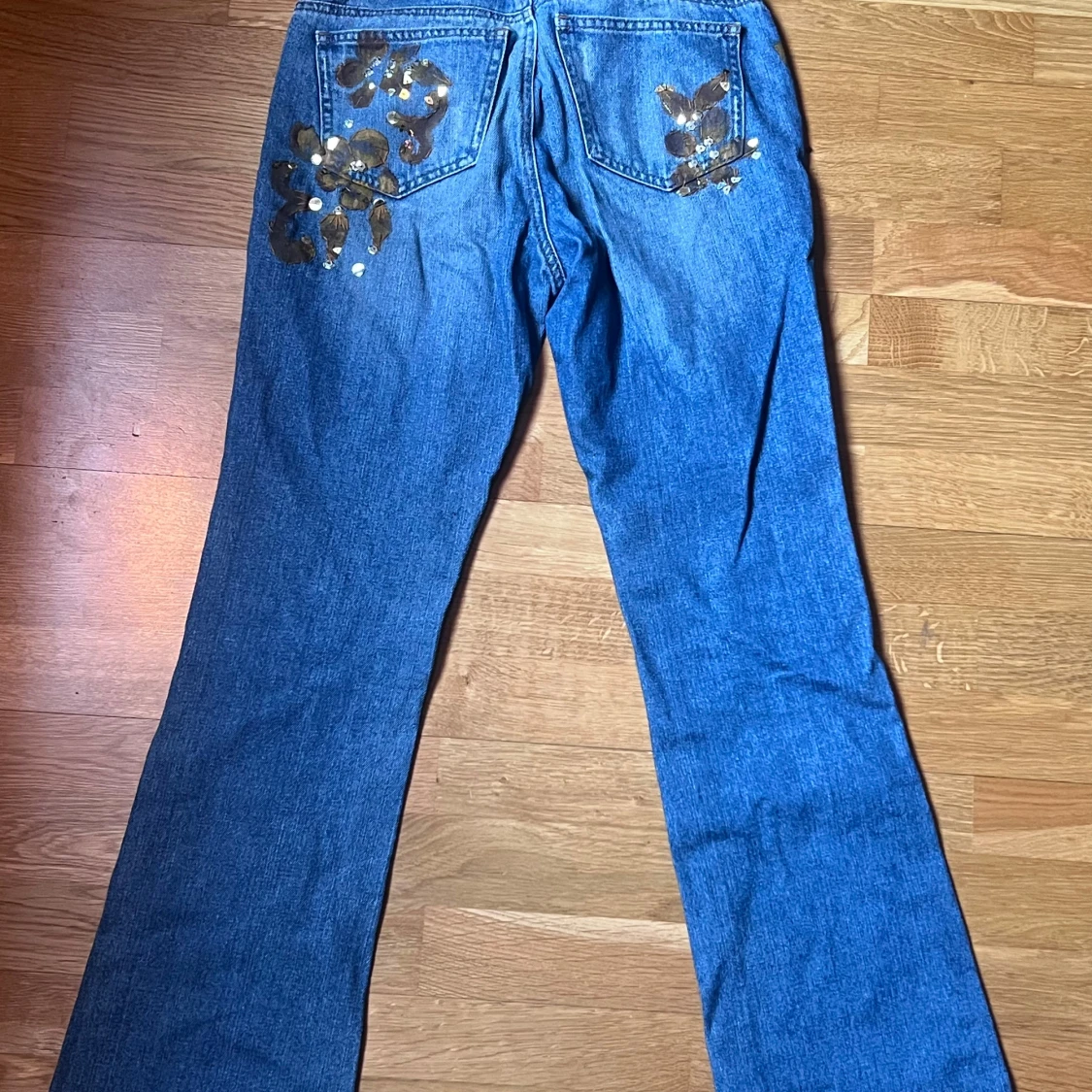 Snygga blå jeans från DKNY med unika guldiga paljettdetaljer på framsidan och bakfickorna. Ganska lågmidjade och lite flare.
