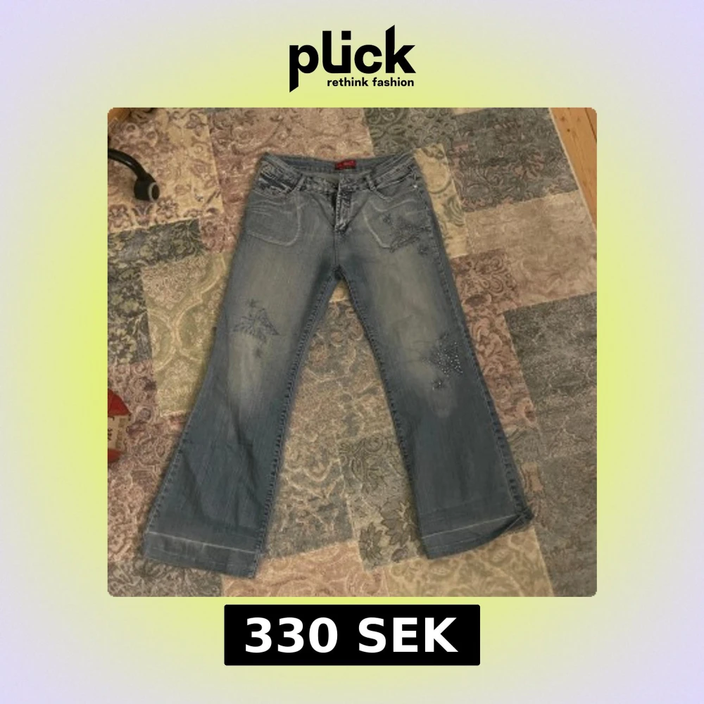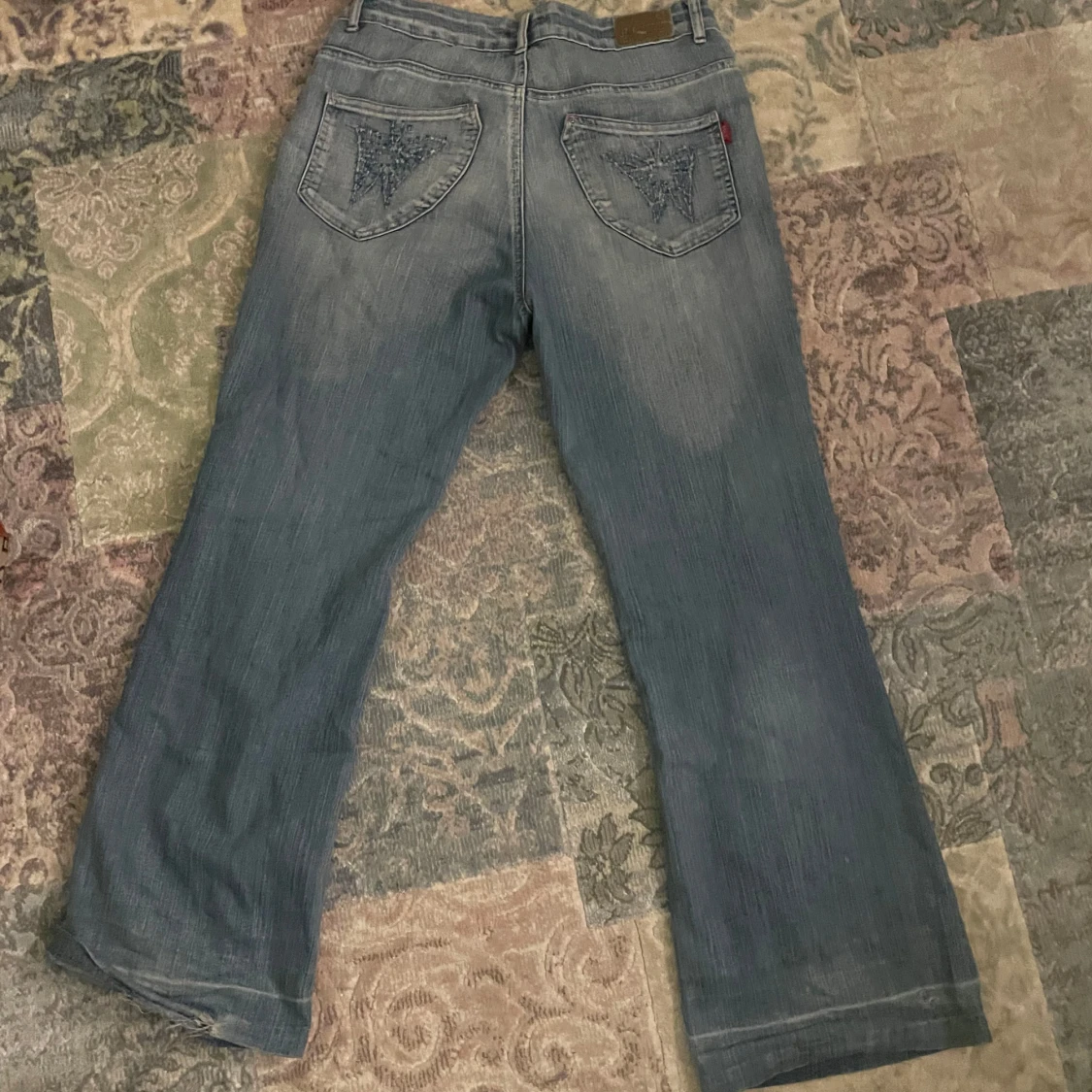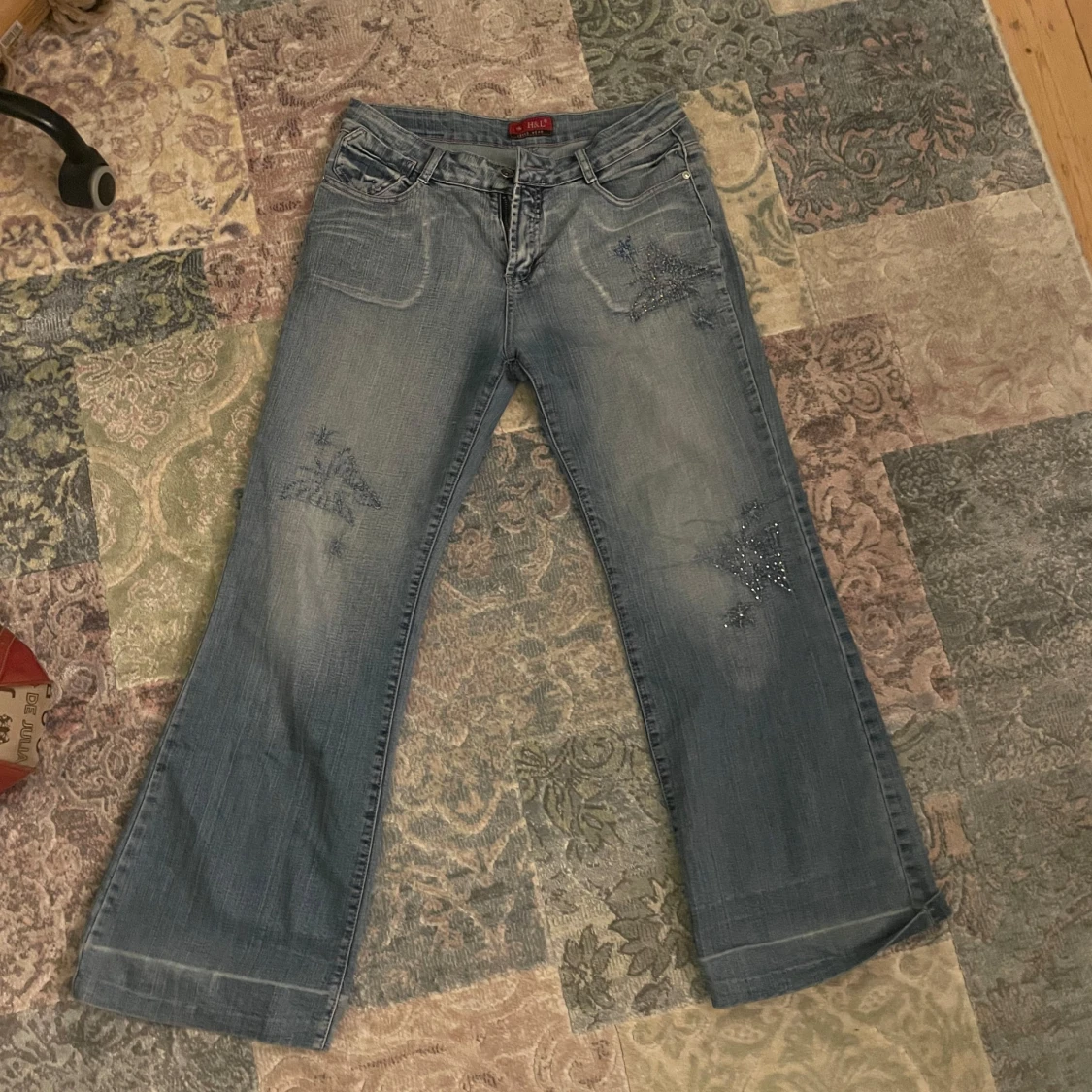 Snygga blå jeans från H&L med unika paljettdetaljer på framsidan och bakfickorna. Byxorna har en bootcut-stil och är perfekta för att ge en extra touch till din outfit. De har en klassisk femficksdesign och en knappgylf.