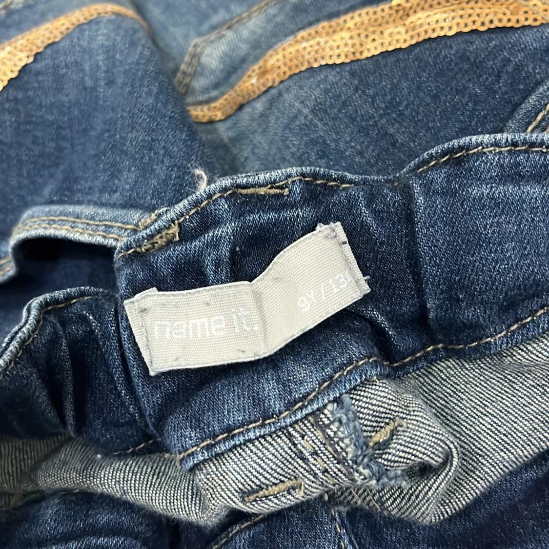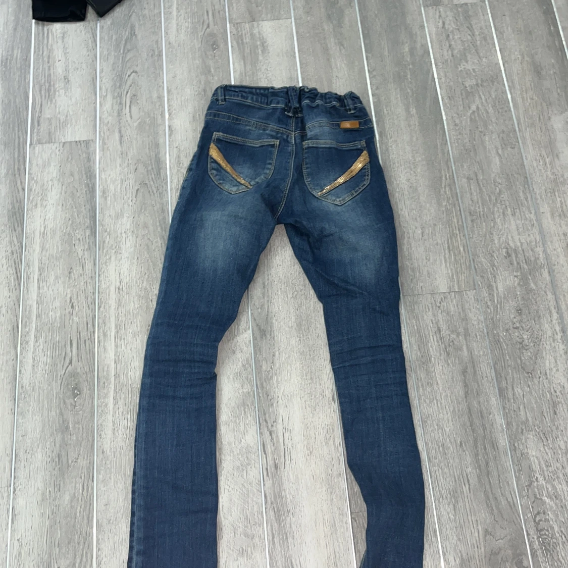 Snygga blå jeans från Name It med glittriga paljettdetaljer på bakfickorna. Perfekta för att ge lite extra stil till vardagslooken. De har en bekväm passform och är tillverkade i ett mjukt denimtyg.
