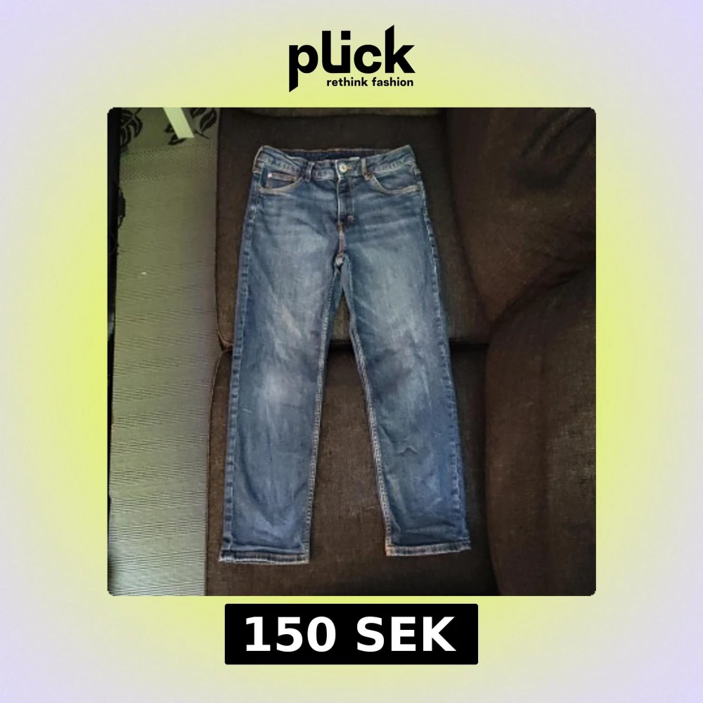 Säljer ett par blå jeans från H&M med relaxed fit och justerbar midja. Byxorna har klassisk femficksdesign, avsmalnande ben och synliga kontrastsömmar. Perfekta för en avslappnad stil. Dock saknas några knappar på back fickorna men annars är det inga större slitage.