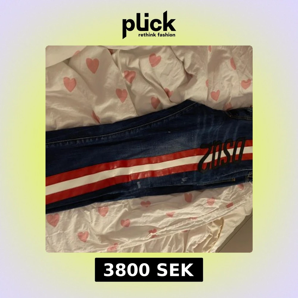 Snygga blå jeans från Dsquared2 med en iögonfallande röd och vit rand längs sidan. Jeansen har en straight passform och är dekorerade med slitningar för en trendig look. Perfekta för dig som vill sticka ut!