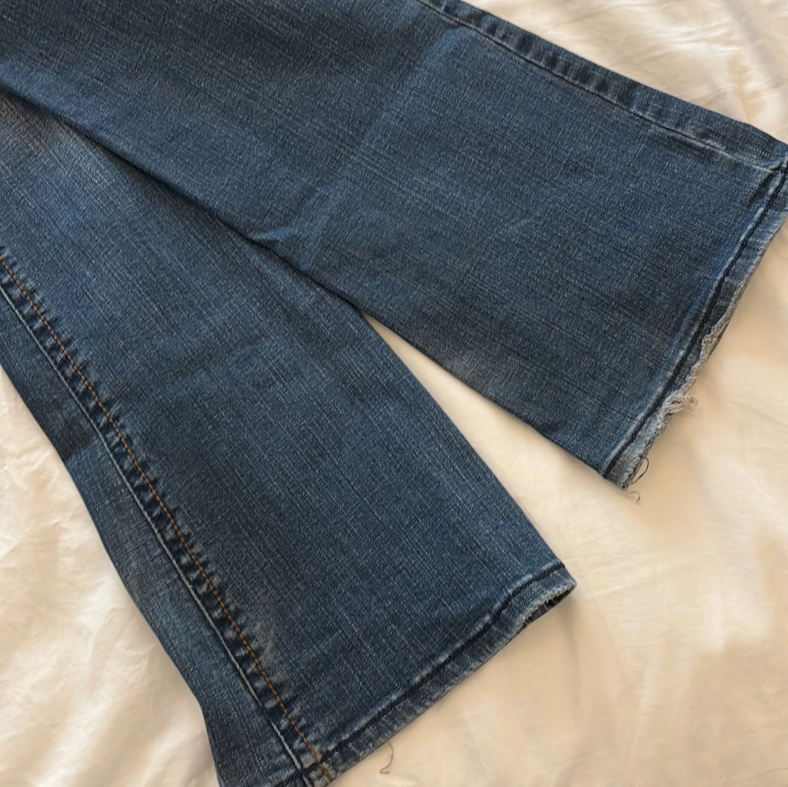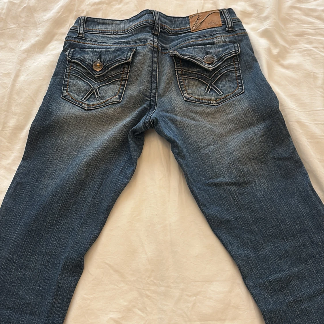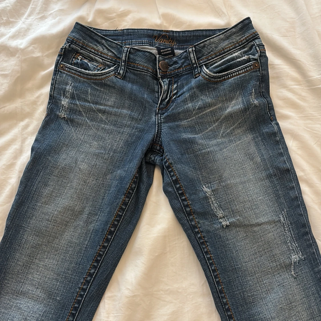 Snygga blå jeans från Vanity med slitna detaljer och dekorativa sömmar på bakfickorna. Bootcut byxor, dem har ingen specifik men passar mig som oftast har storlek 34-36 men andra mått kan jag skicka om du är intresserad 💕