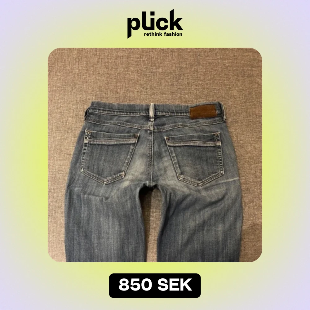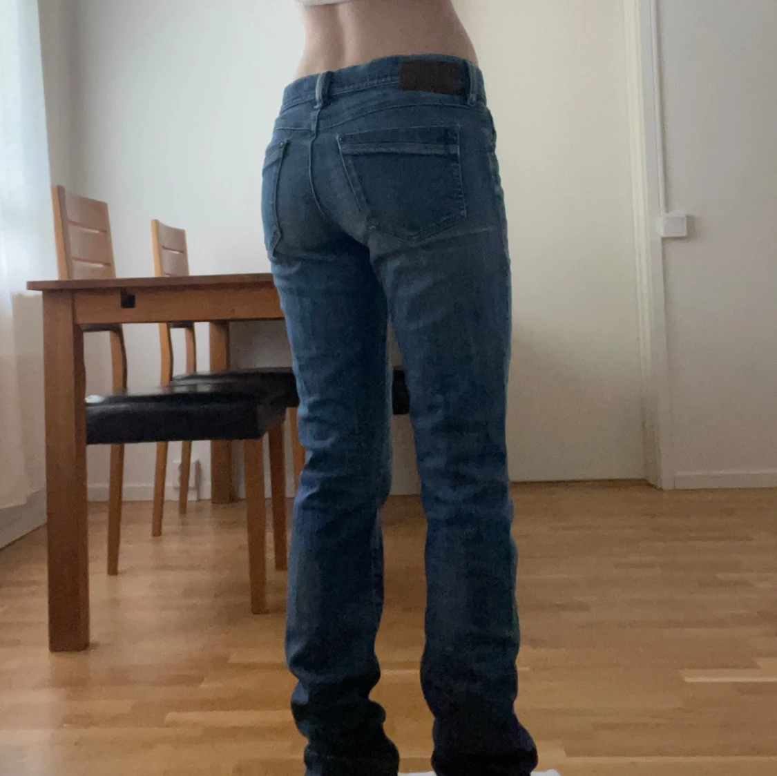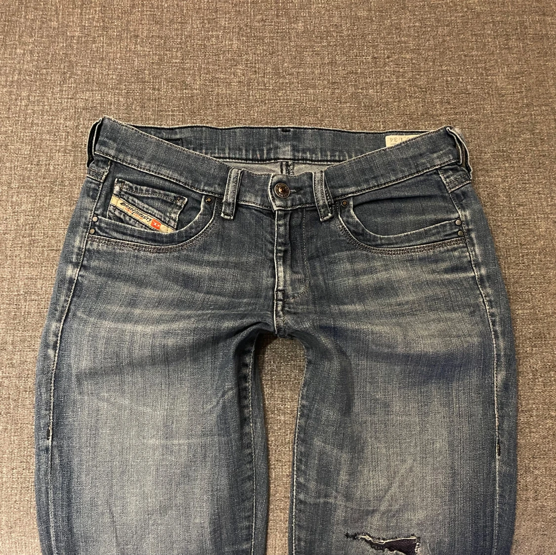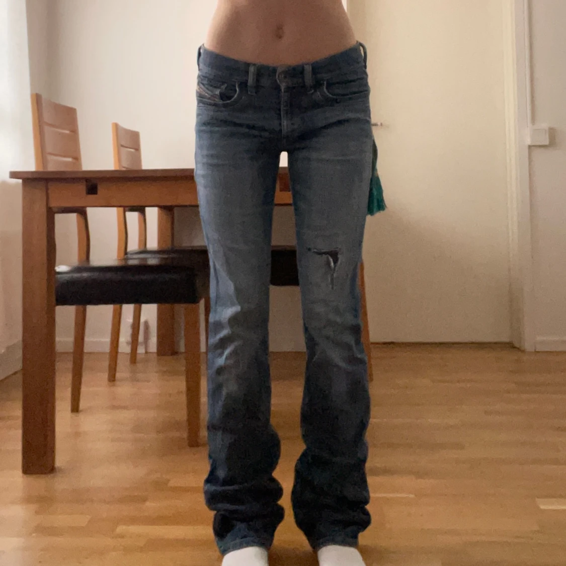 Säljer ett par snygga blå bootcut jeans från Diesel med slitningar på framsidan. Jeansen är i normal passform och ser ut att vara i bra skick. Stretchigt material, midjemått ca 38 Innerbenslängd ca 86 💕 Jag är 165