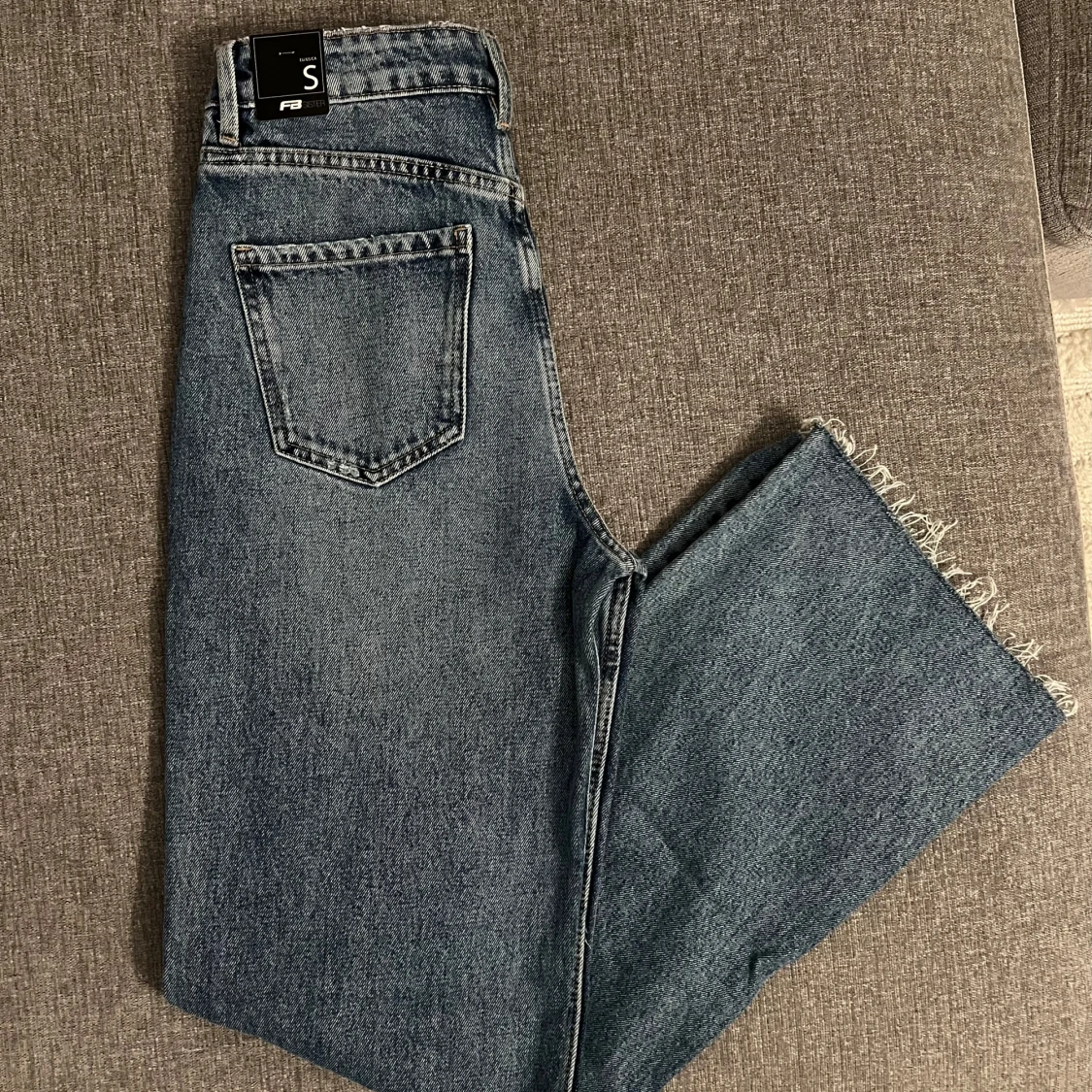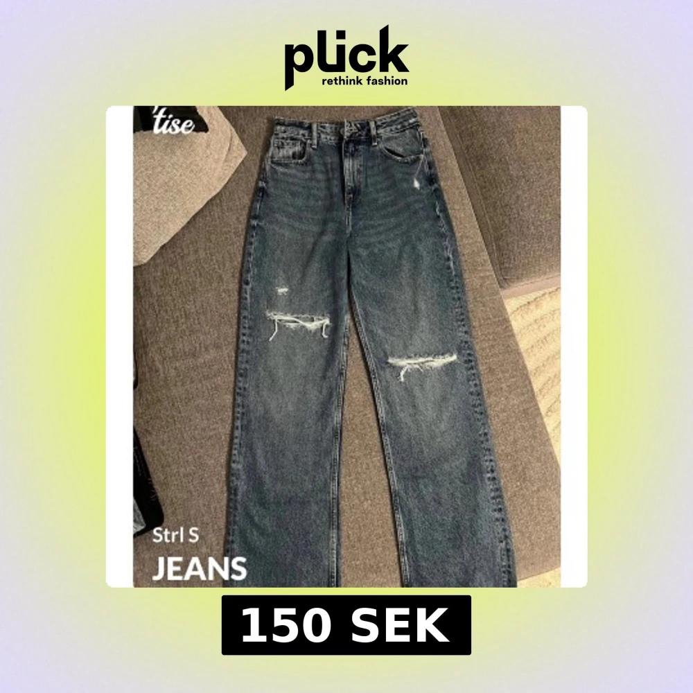 Snygga blå jeans i storlek S med slitningar på knäna för en trendig look. De har en klassisk femficksdesign och är perfekta för en avslappnad stil. Jeansen har en rak passform och fransiga benslut.