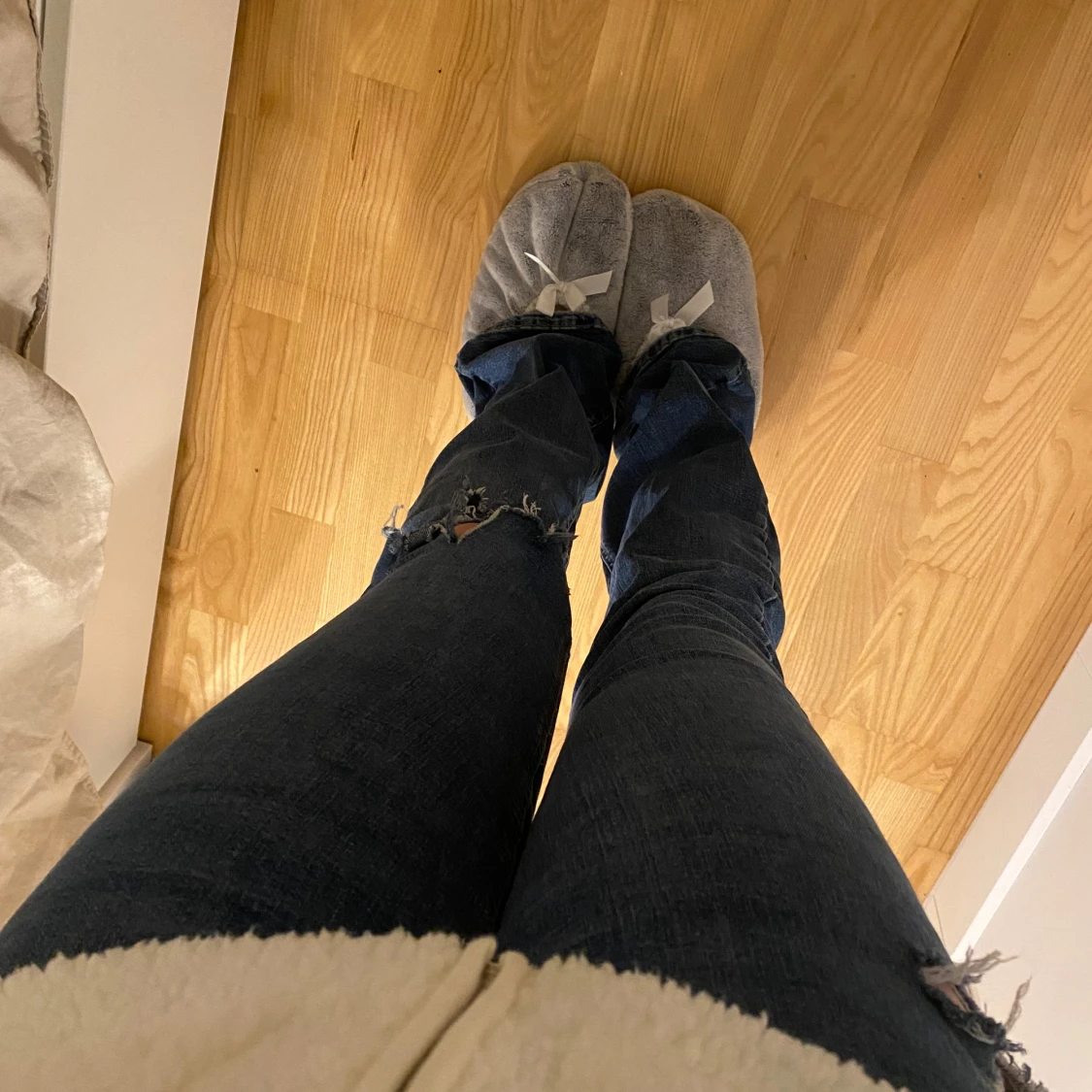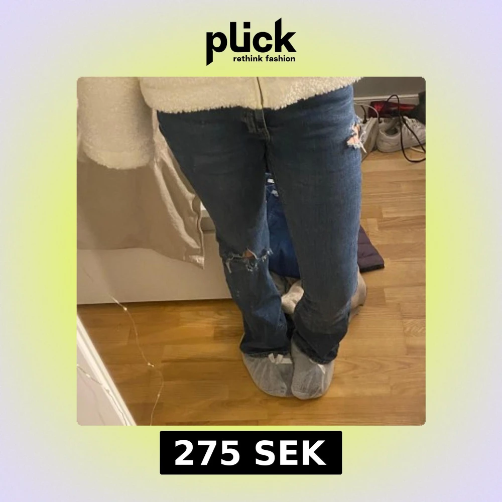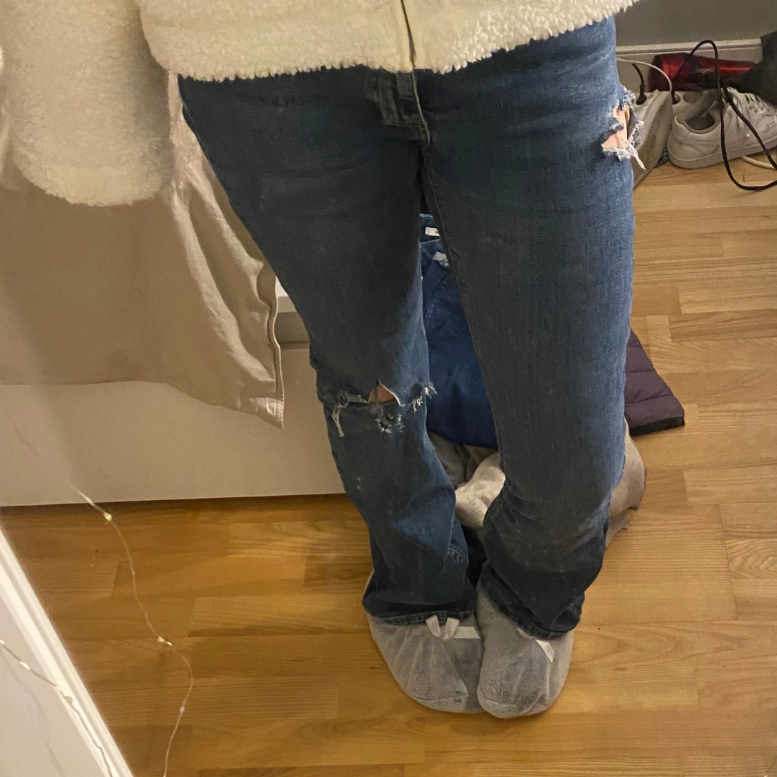 Säljer ett par blå jeans med coola slitningar på knäna. De är lågmidjade och bootcut. Jeansen är i en mörkare blå nyans. Pris kan diskuteras, kan lösa fler bilder om så önskas💗