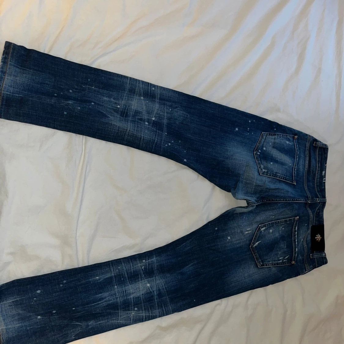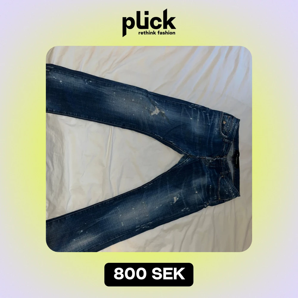 Säljer ett par snygga blå jeans med coola slitningar. De har en klassisk femficksdesign och en bekväm passform. Perfekta för en avslappnad vardagslook eller en utekväll. Passar till det mesta i garderoben!
