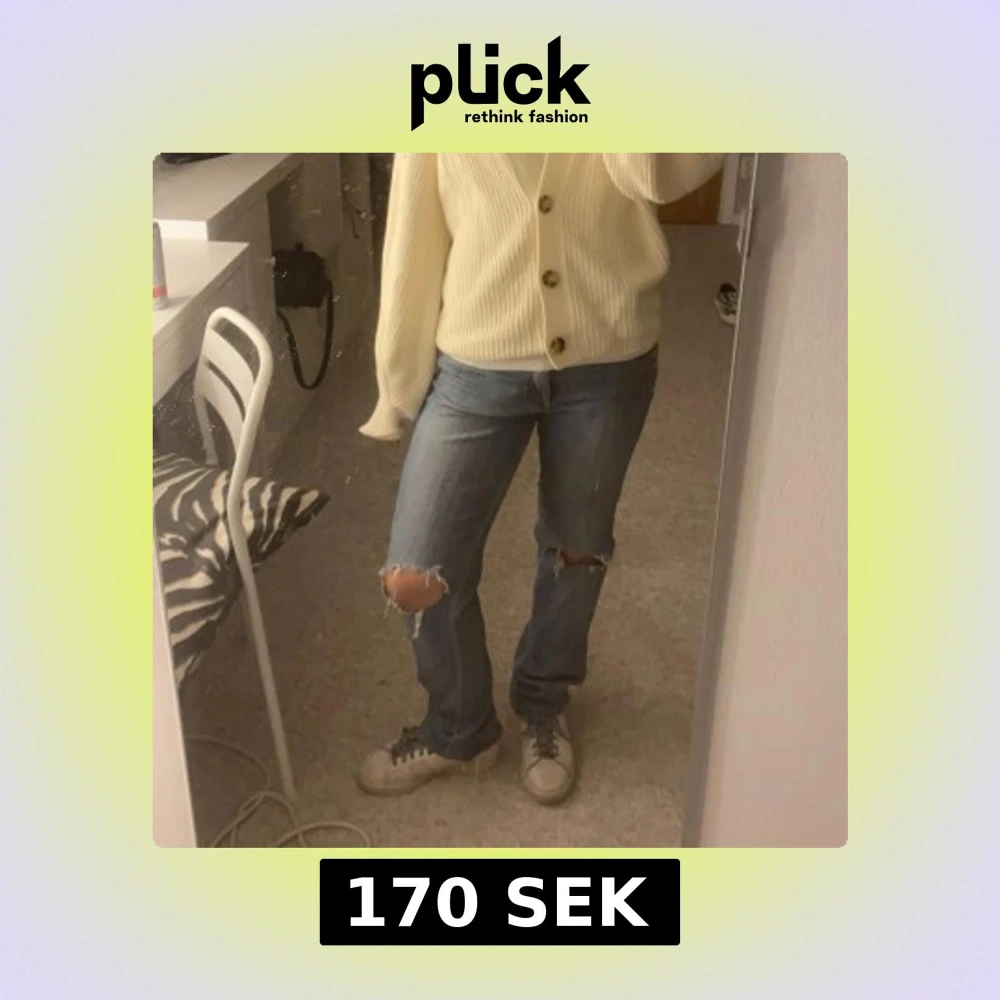 Snygga blå jeans med slitningar på knäna. De är vintage och lågmidjade💕💕Men även sjukt coola fickor. Skulle säga att passformen är straight😍 Hittar inte vad storleken riktigt är men skulle säga en M, (står 38 N i jeansen). Toppenskick😇Skriv för frågor eller prisförslag.