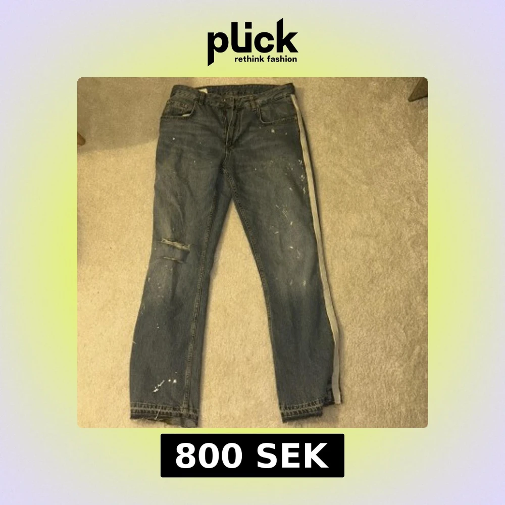 Säljer ett par blå jeans med slitningar och färgstänk för en cool, avslappnad look. Byxorna har en rak passform och klassisk femficksdesign. Perfekta för en casual stil. Byxorna är helt slutsålda. Nypris 699.