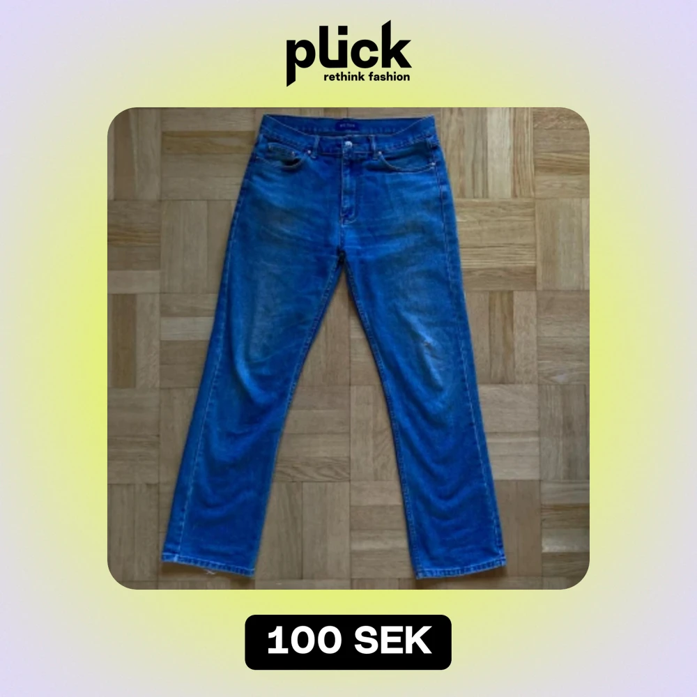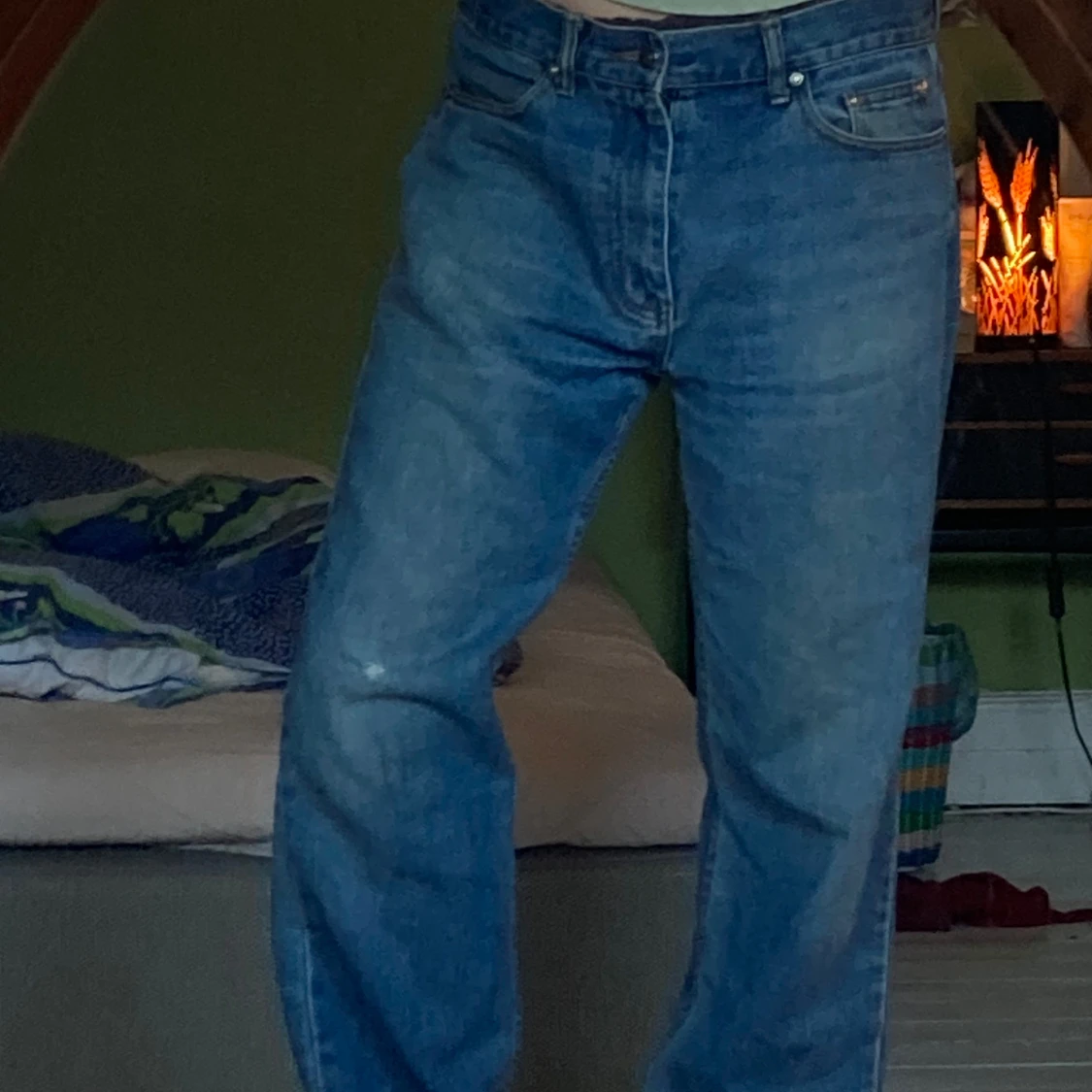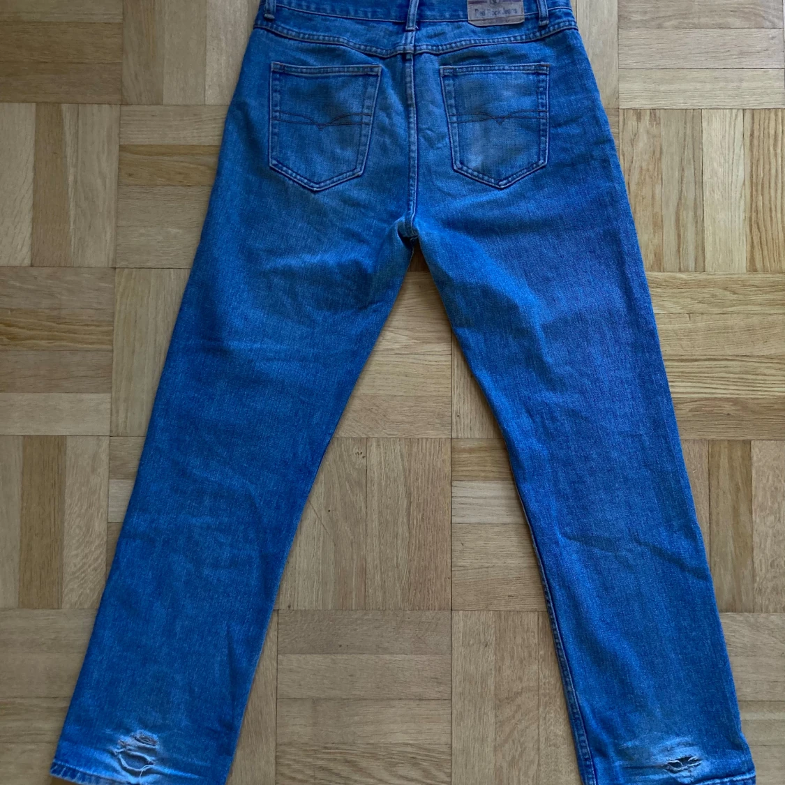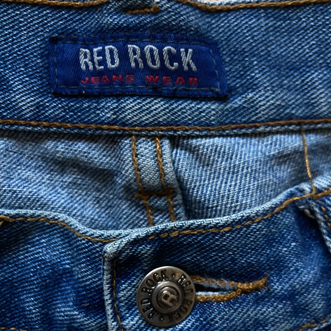 Blå snygga jeans från Red Rock! Slitna på baksidan vid hälarna (se bild 2) och litet hål framtill på ena knät (se bild 4), men i övrigt i fint skick.