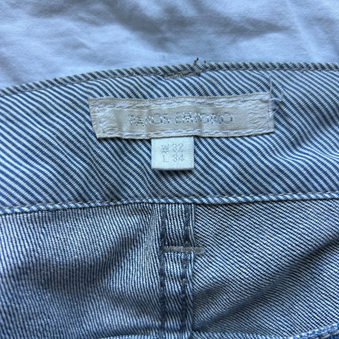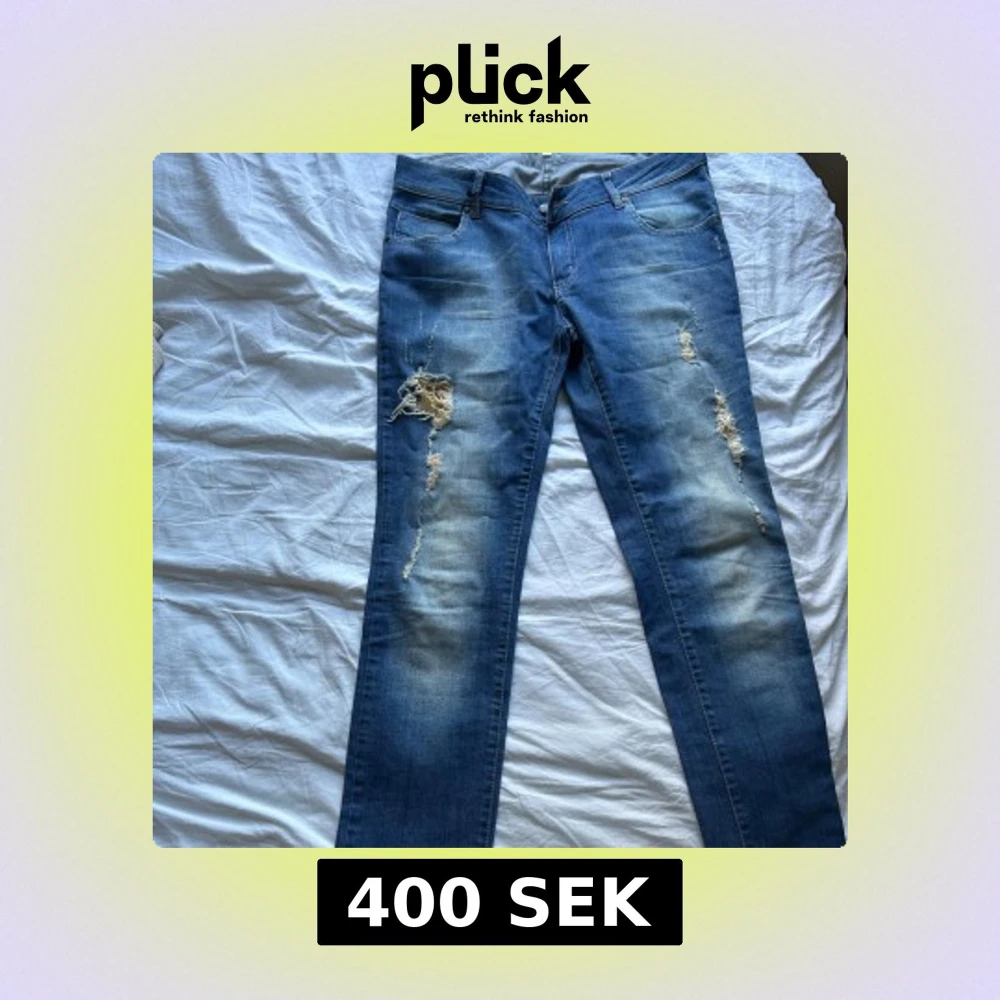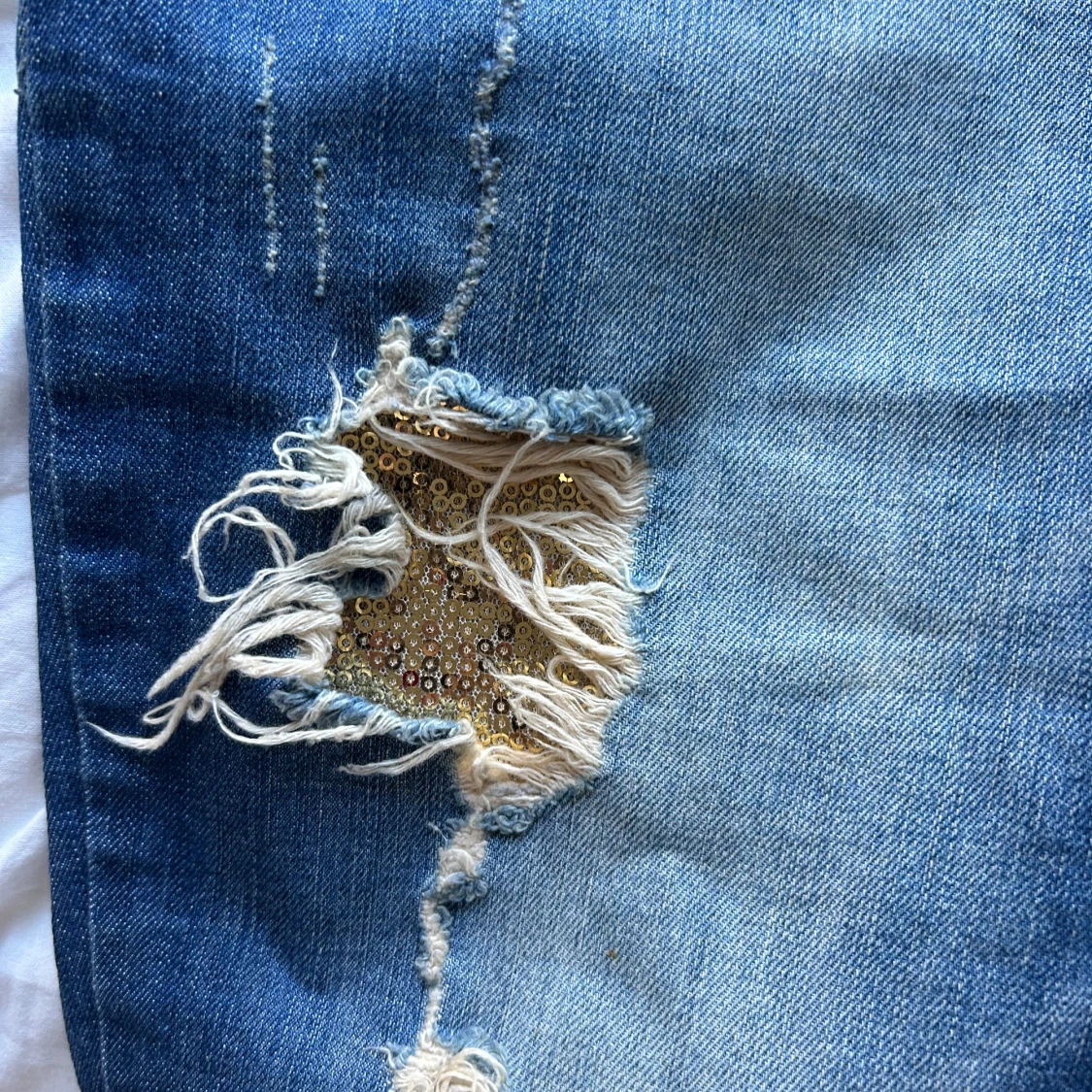Snygga blå jeans från Panos Emporio med slitna detaljer och coola guldpaljetter under trasorna på benen. Klassisk femficksmodell i denim med raka ben och normal passform. Perfekta för dig som gillar stockholmsstil.