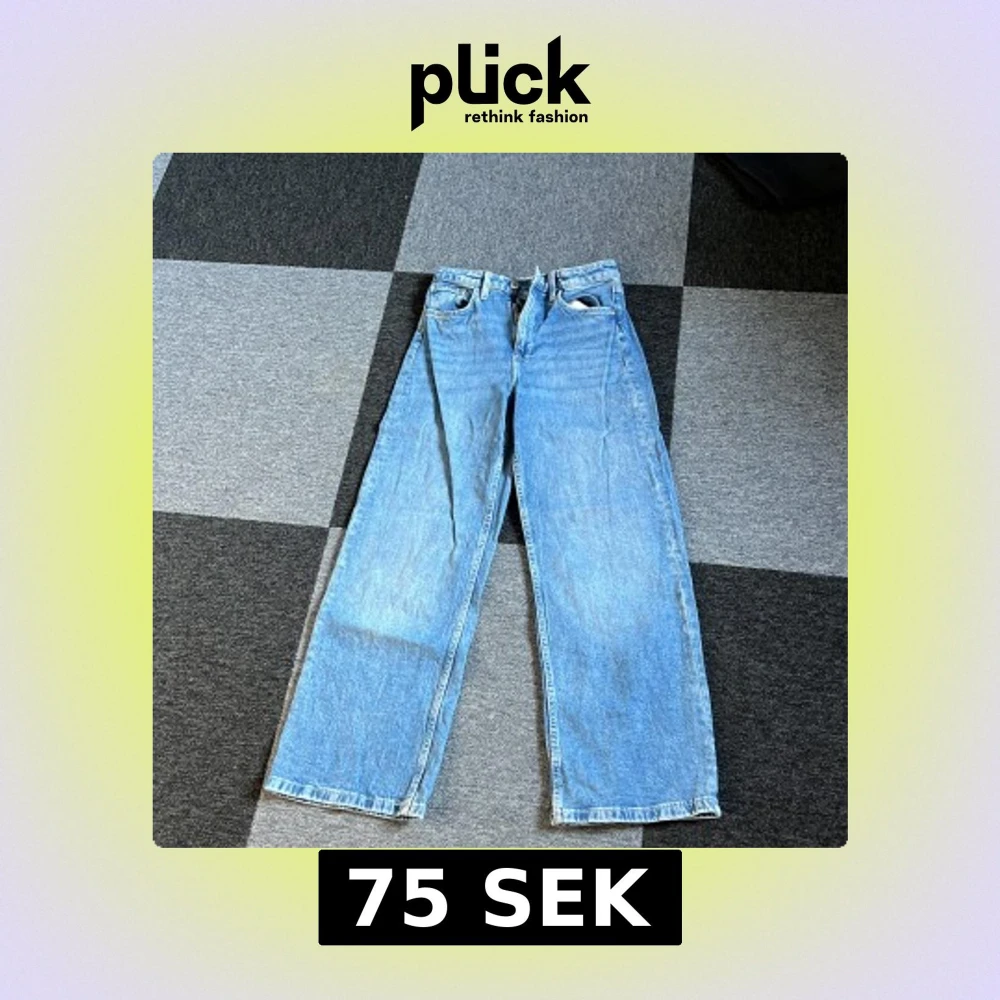 Säljer ett par snygga blå jeans från H&M med vida ben och hög midja. De har en justerbar midja och stängs med dragkedja och knapp. Perfekta för en avslappnad stil.