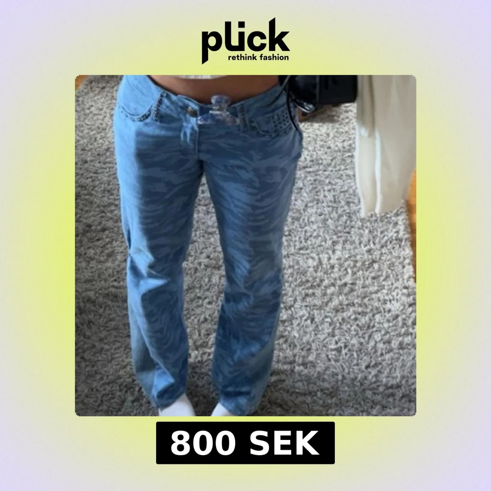 Säljer ett par blå jeans med camouflagemönster och coola nitar vid fickorna. Byxorna är bootcut och lågmidjade💗💗💗skriv för fler bilder