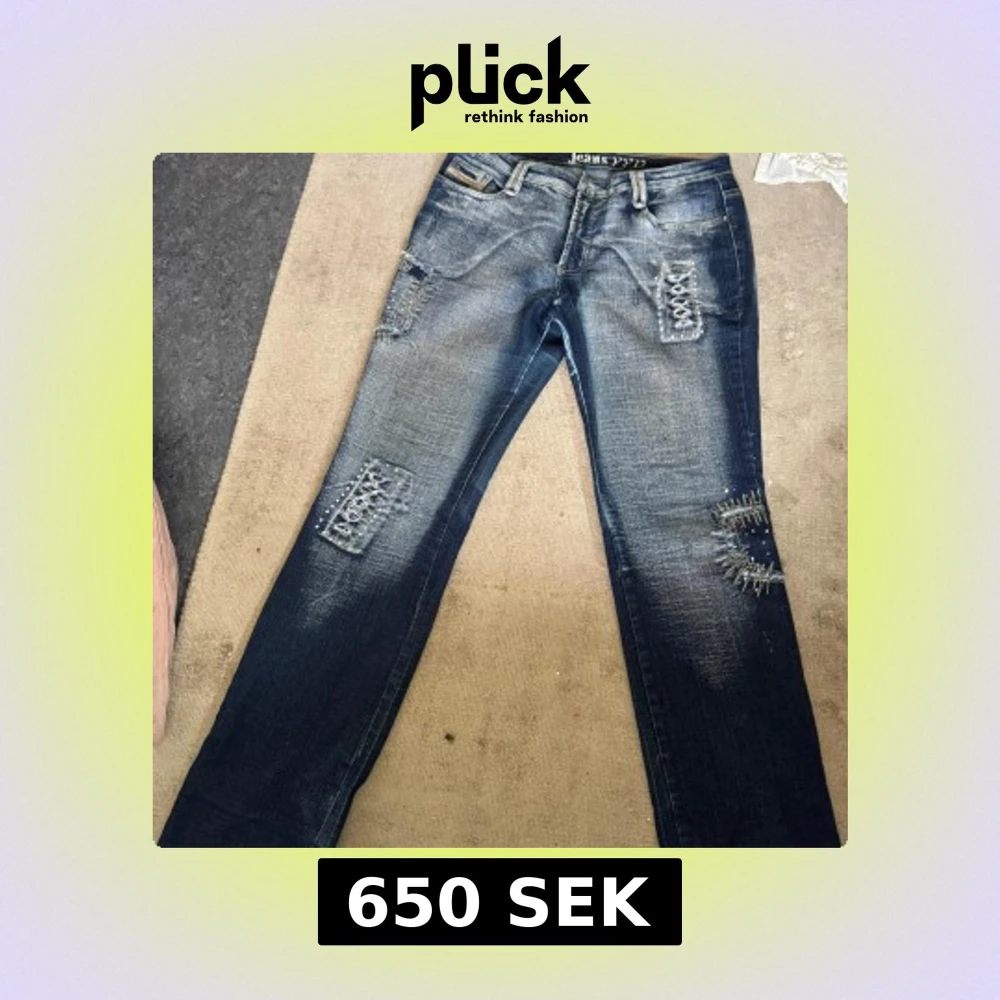 Säljer ett par blå jeans från Jeans PYP med slitna detaljer och snörning på både fram- och bakfickor. Jeansen har en tvättad look, raka ben och coola nitar runt snörningen. Perfekta för dig som gillar en edgy stil.