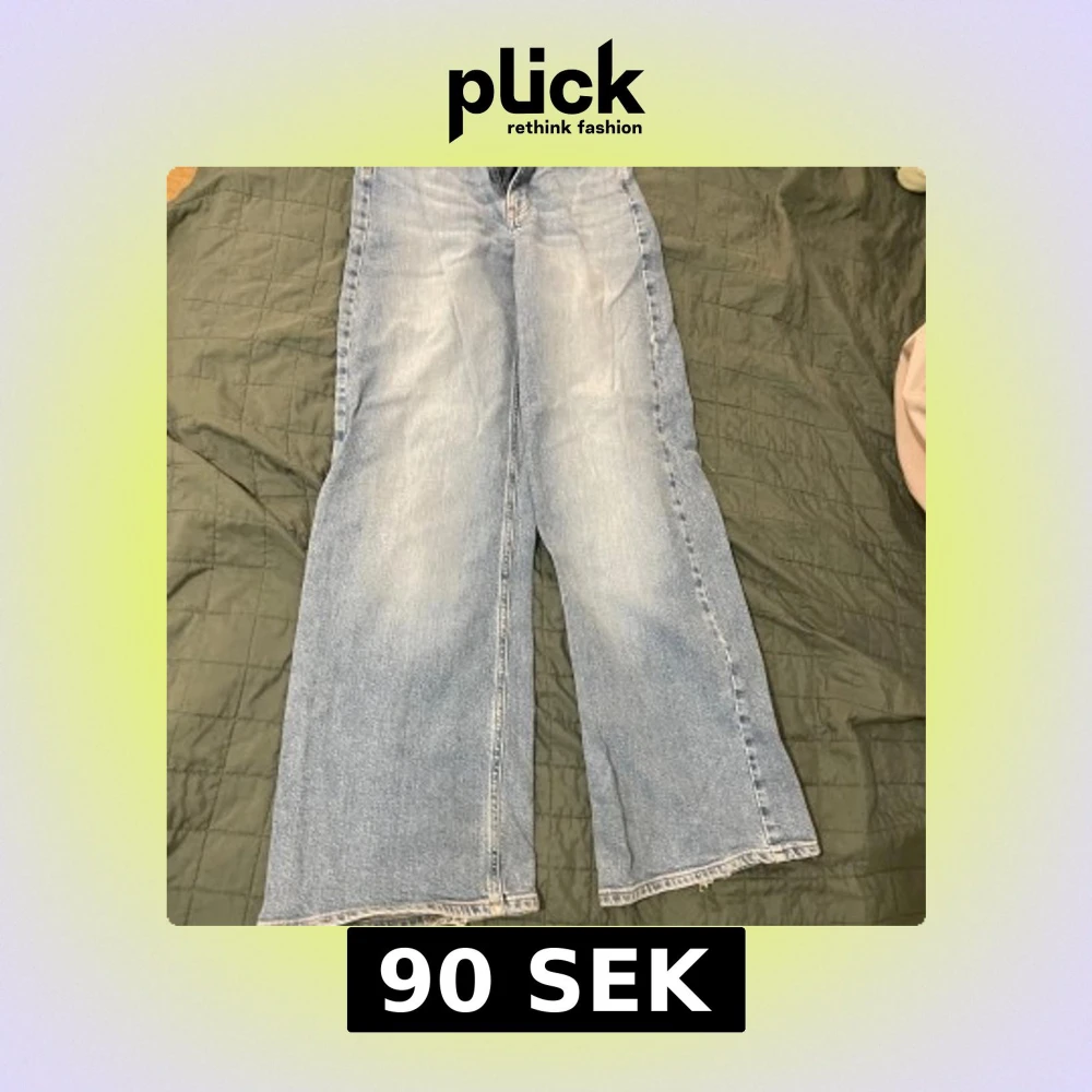 Säljer ett par snygga blå jeansbyxor från CW storlek 34. Byxorna har en hög midja och en bred passform som ger en avslappnad look. Perfekta för en trendig stil!