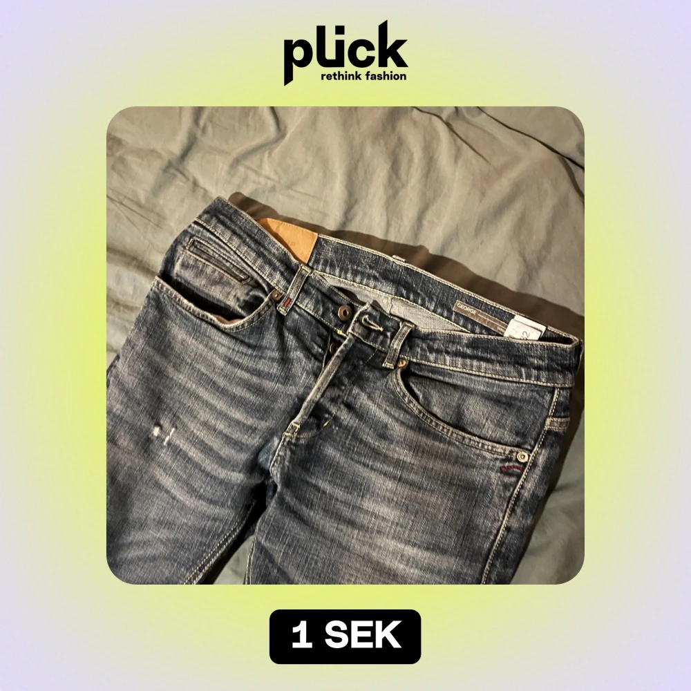Säljer ett par snygga blå jeansbyxor från dondup. De har en klassisk femficksdesign med en knapp och dragkedja framtill. Byxorna har en lätt slitning för en cool, avslappnad look. Perfekta för både vardag och fest!