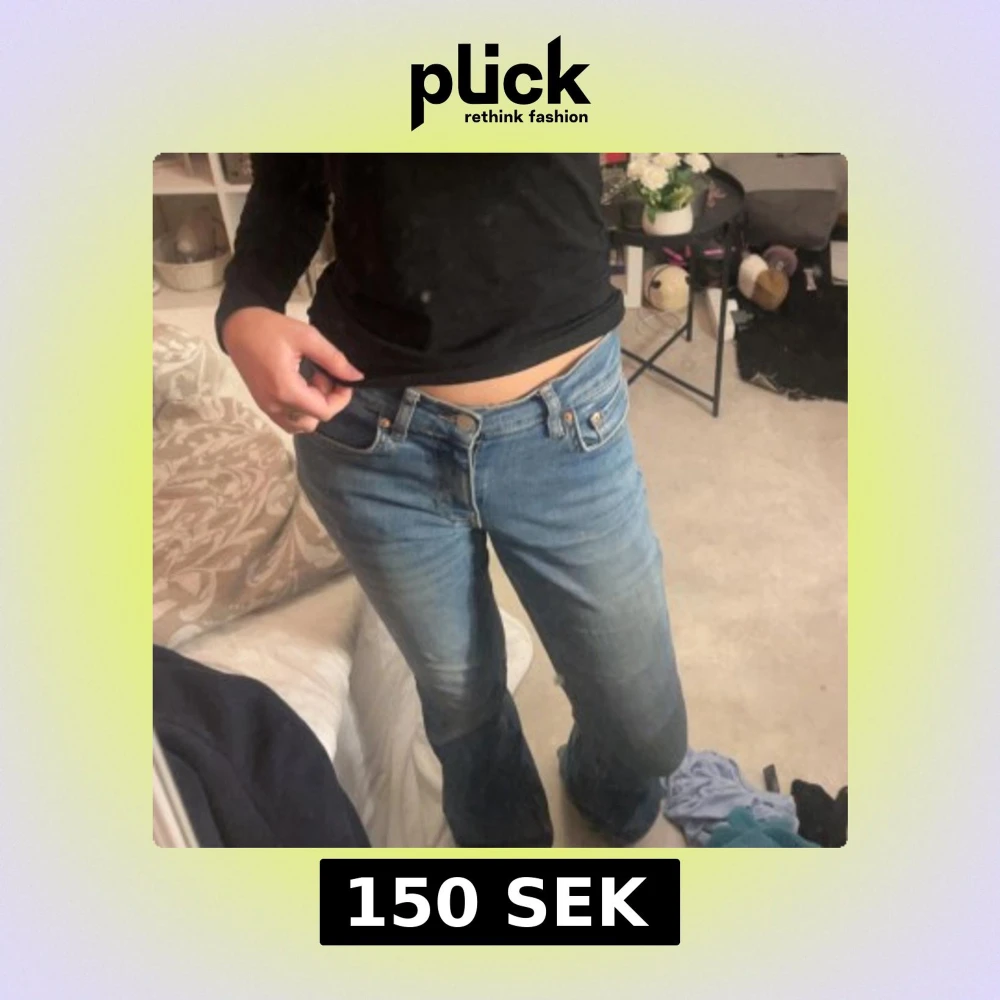 Säljer ett par klassiska blå jeansbyxor från Gina tricot i storlek 34. Byxorna har låg midja. Perfekta till vardags och enkla att matcha med olika toppar.