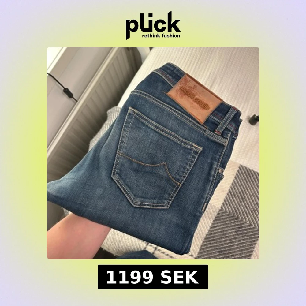 Snygga blå jeansbyxor från Jacob Cohen med klassisk femficksdesign och en läderpatch på baksidan. Liten lagning i skrevet, syns på sista bilden. Perfekta för en avslappnad stil.