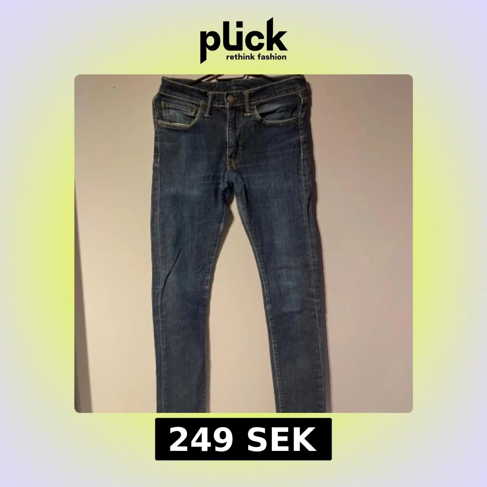 Snygga blå jeansbyxor från Levis. De är slim fit och är storlek 29/32. Märkeslappen syns tydligt på baksidan. De har haft ett hål vid skrevet men är lagat och syns knappt tycker jag.
