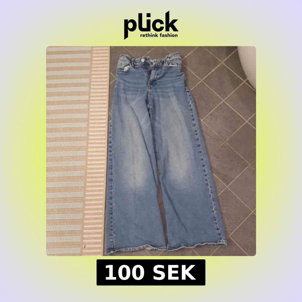 Säljer ett par blå jeansbyxor från Lindex med hög midja och vida ben. Byxorna har en klassisk femficksdesign och en knappgylf. Perfekta för en avslappnad stil.