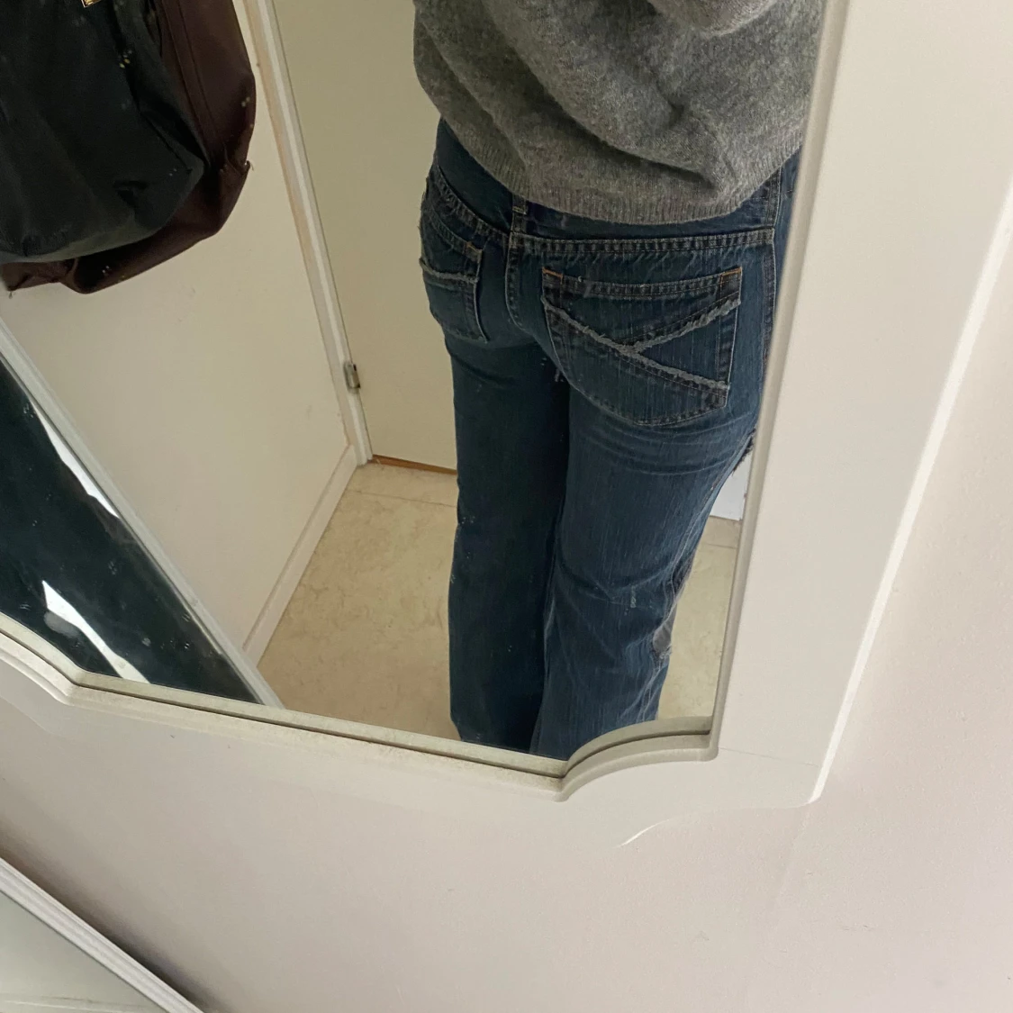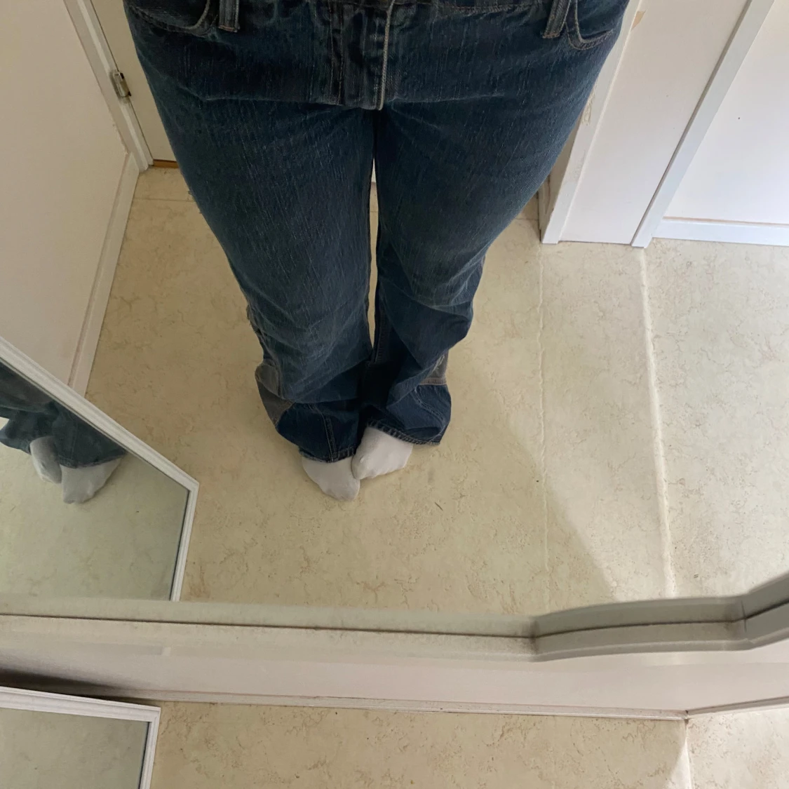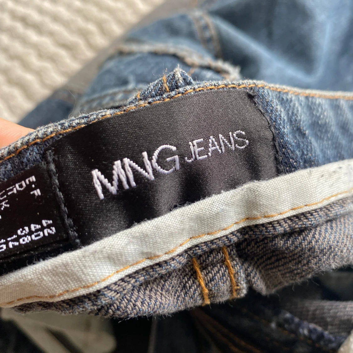 Säljer ett par blå jeansbyxor från MNG detaljer på både fickor och sidorna av benen.