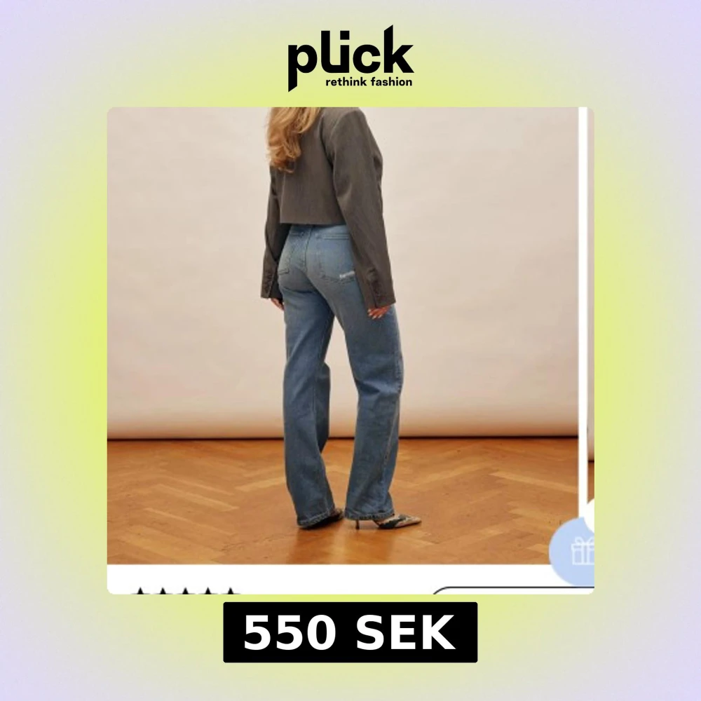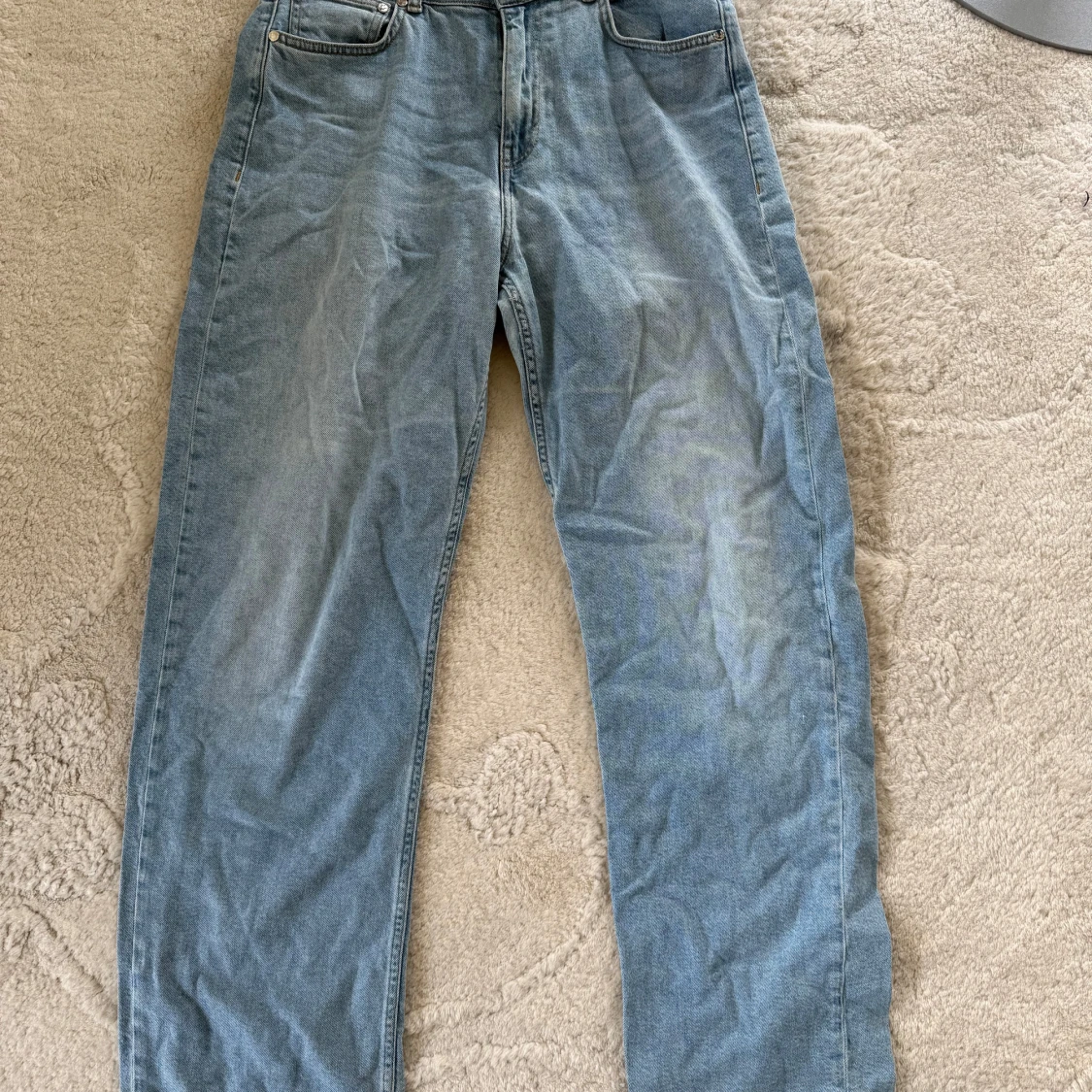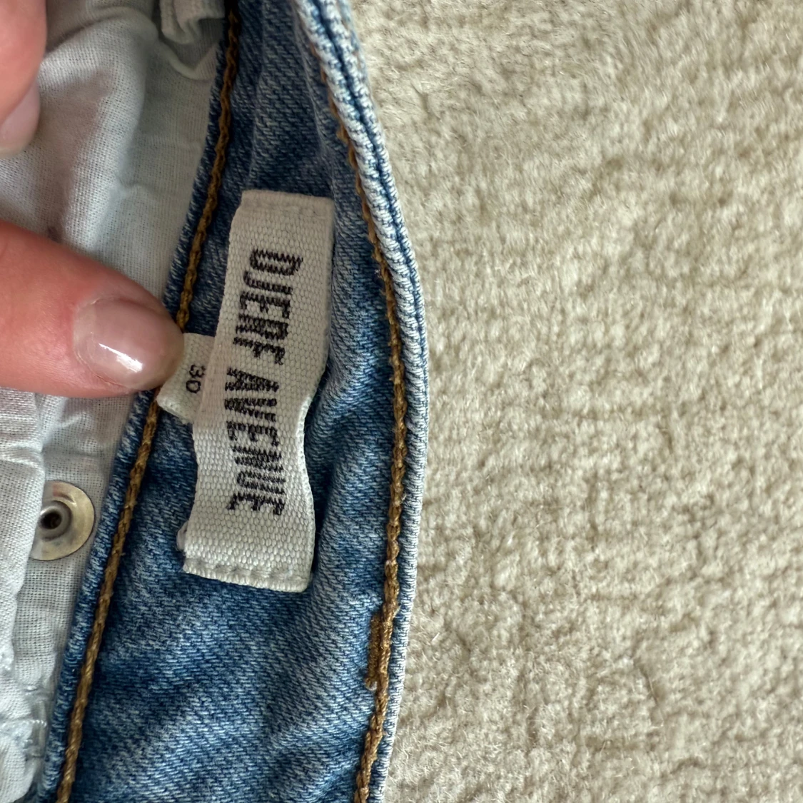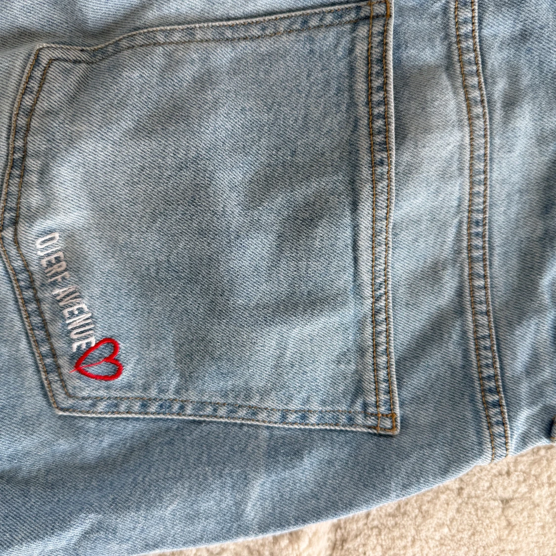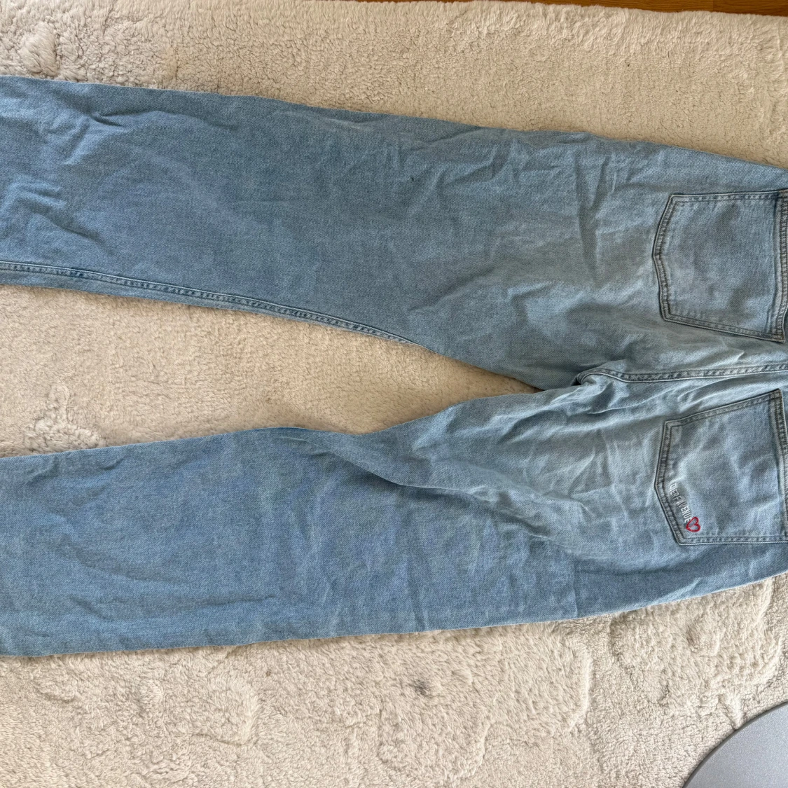 Säljer ett par jeansbyxor från Djerf Avenue med broderad logga och röd hjärtdetalj på bakfickan. Byxorna har normal passform och raka ben, perfekt för en avslappnad stil.