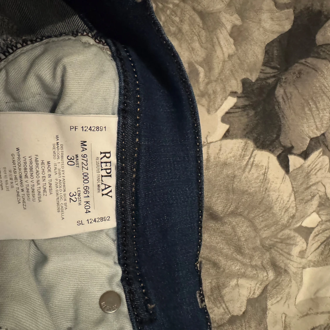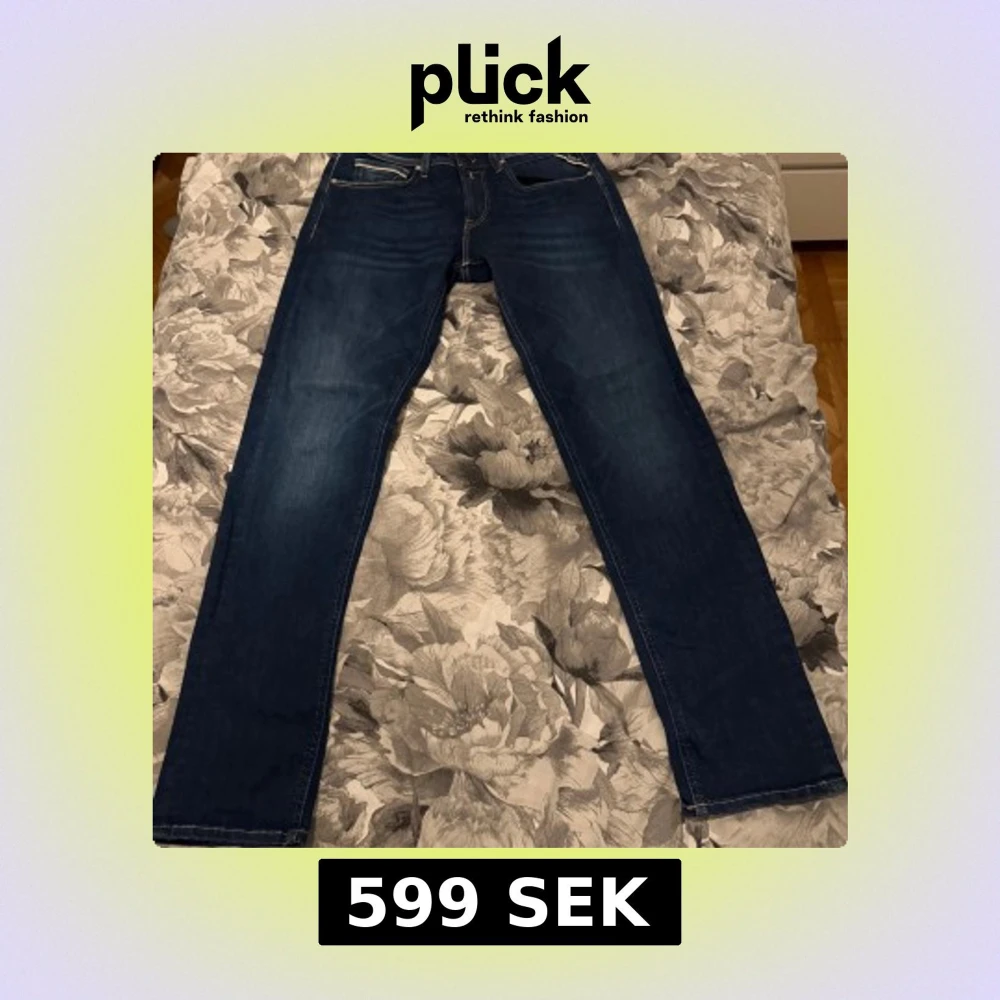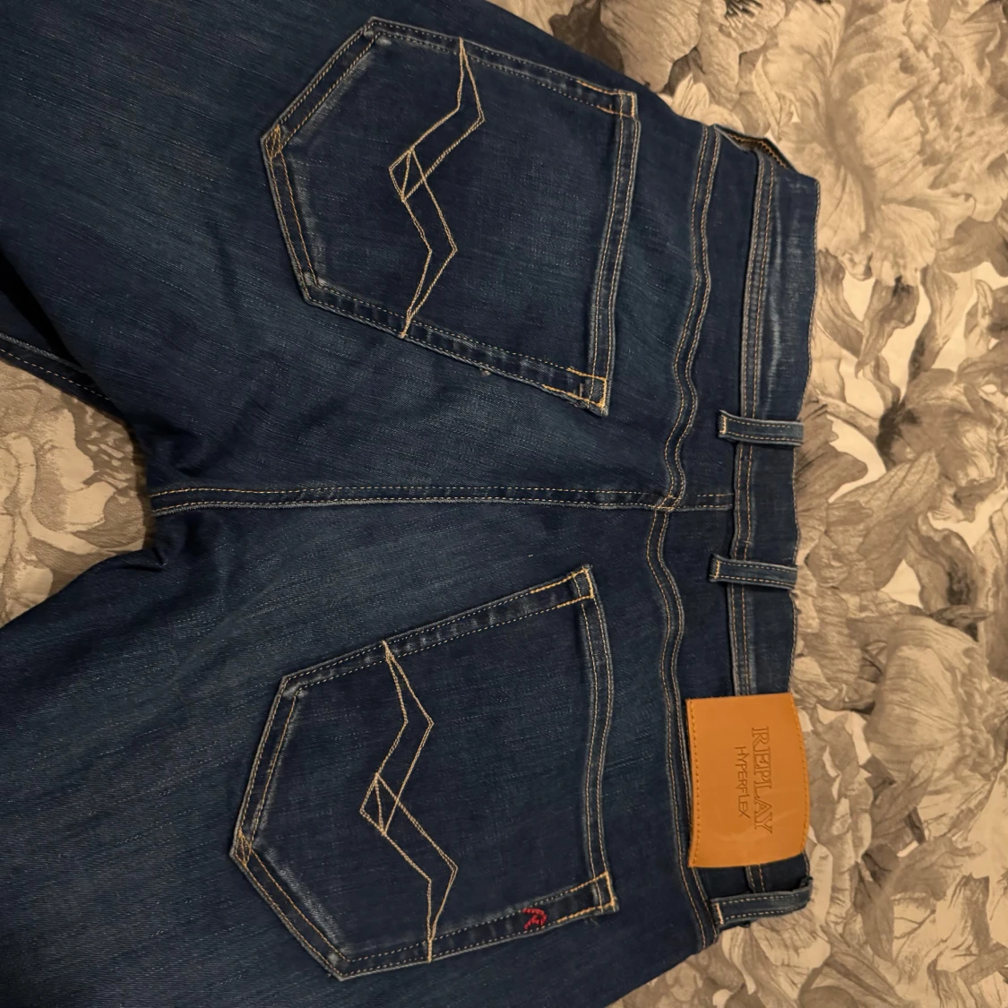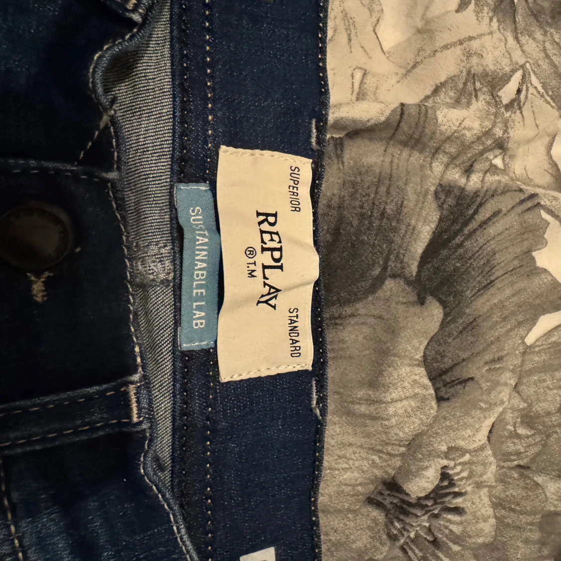 Säljer ett par klassiska blå jeans från Replay med snygga bakfickor och kontrastsömmar. Modellen har normal passform och raka ben, perfekt för en stilren look. Märkta med Sustainable Lab och Replay-logga på insidan.