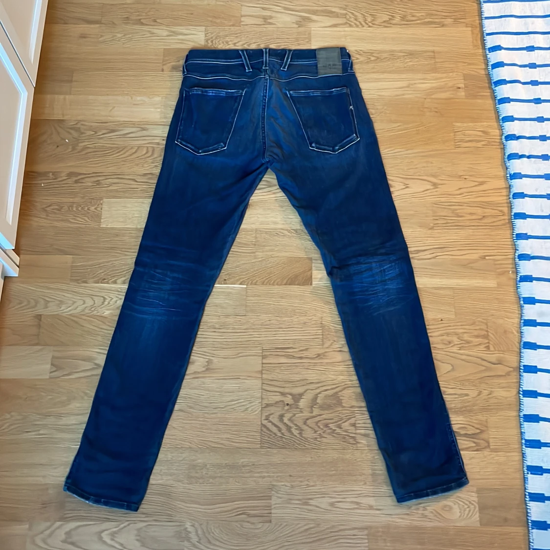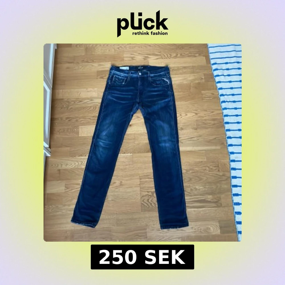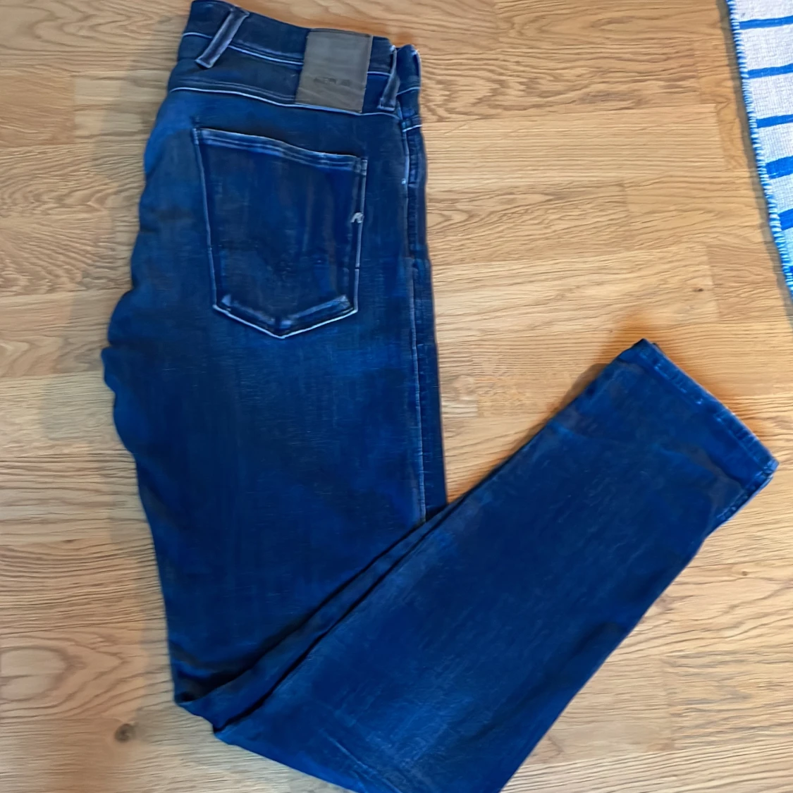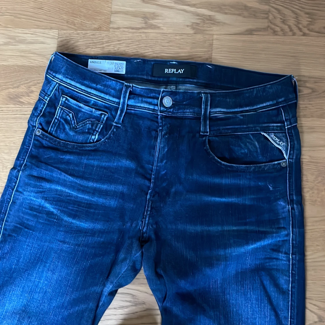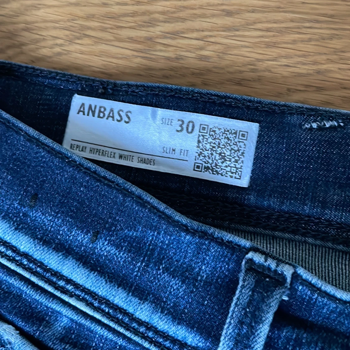 Snygga blå jeansbyxor från Replay i modellen Anbass. De har en slim fit och är tillverkade i ett stretchigt material för extra komfort. Klassisk femficksdesign med dragkedja och knapp. Perfekta för en stilren look. W30 L32