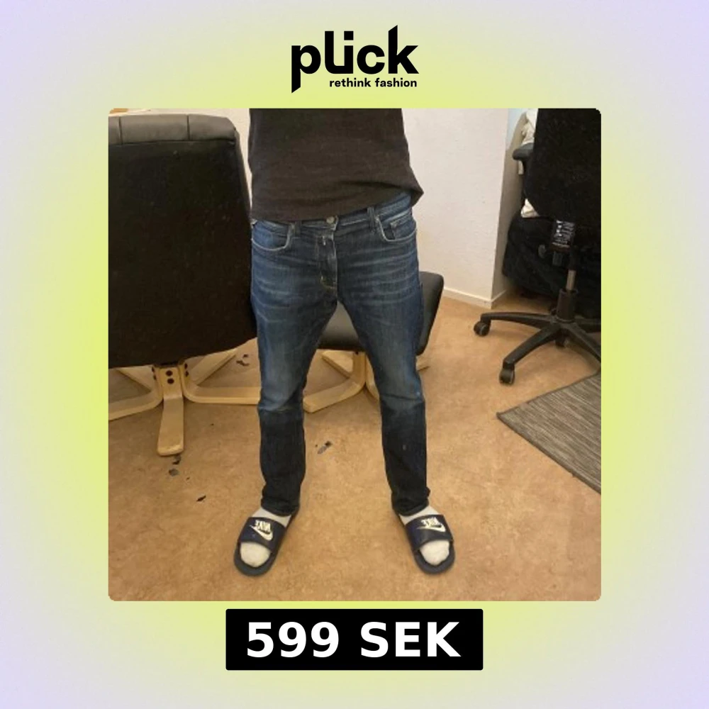 Säljer ett par klassiska blå jeansbyxor från Replay, Jeansen har normal passform och snygga kontrastsömmar. Perfekta för dig som gillar en tidlös stil och vill ha ett par jeans som funkar till det mesta. Rekommenderar att vara runt 165-180 beror på hur man vill att de ska sitta, borde sitta perfekt om man är runt 170