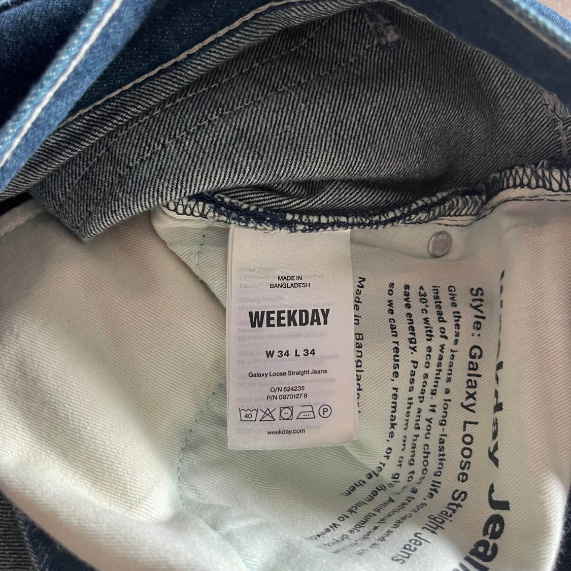 Säljer ett par klassiska blå jeans från Weekday i modellen Galaxy Loose Straight Jeans. Byxorna har raka ben och normal passform, tillverkade i denim med fem fickor och gylf med dragkedja.