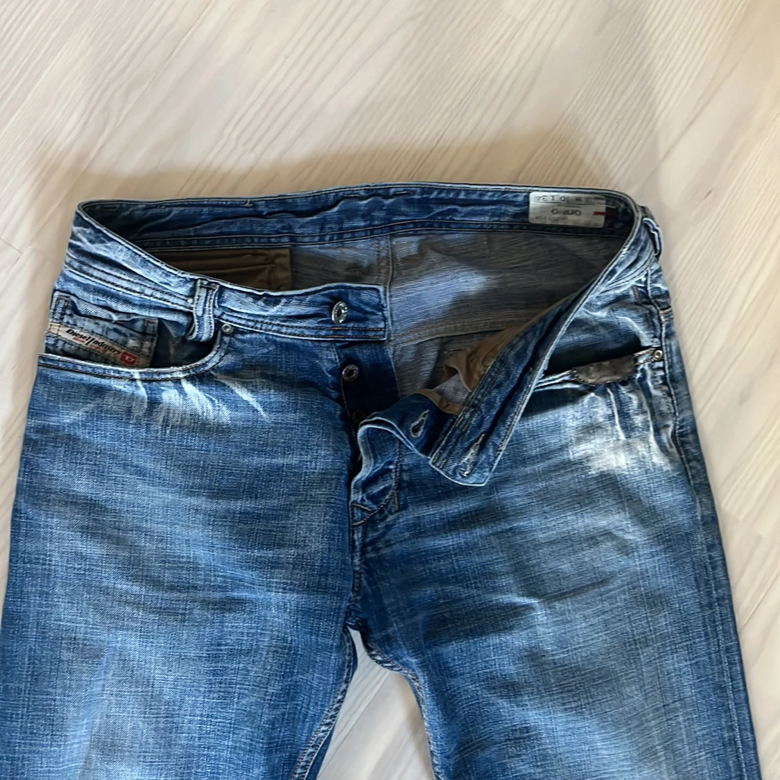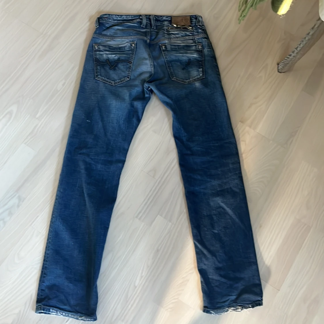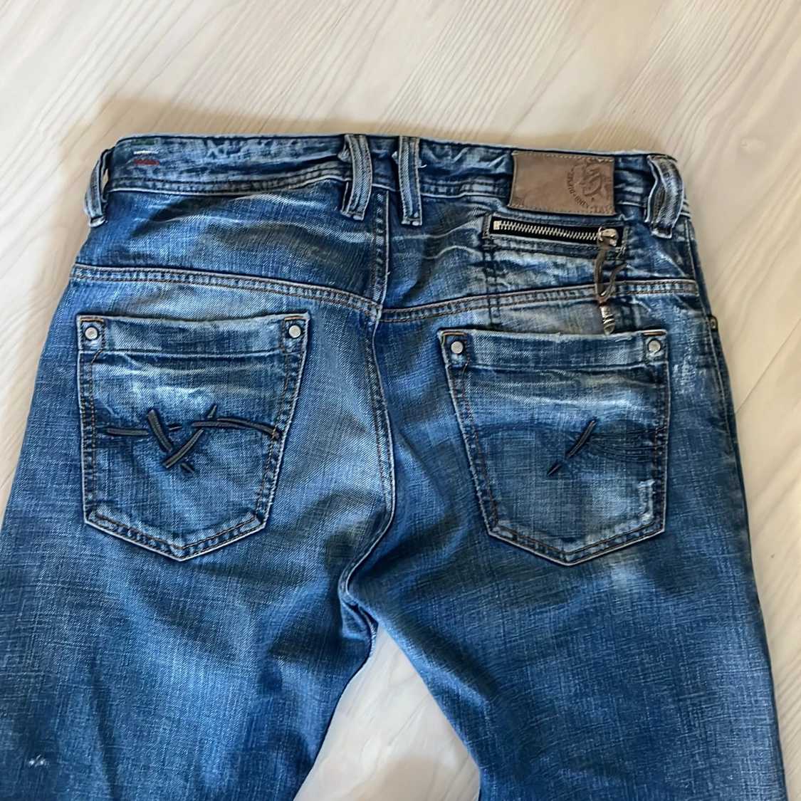Snygga blå jeans med en straight passform och coola slitningar. Byxorna har knappar och dragkedja framtill samt unika detaljer på bakfickorna. Perfekta för en avslappnad stil.