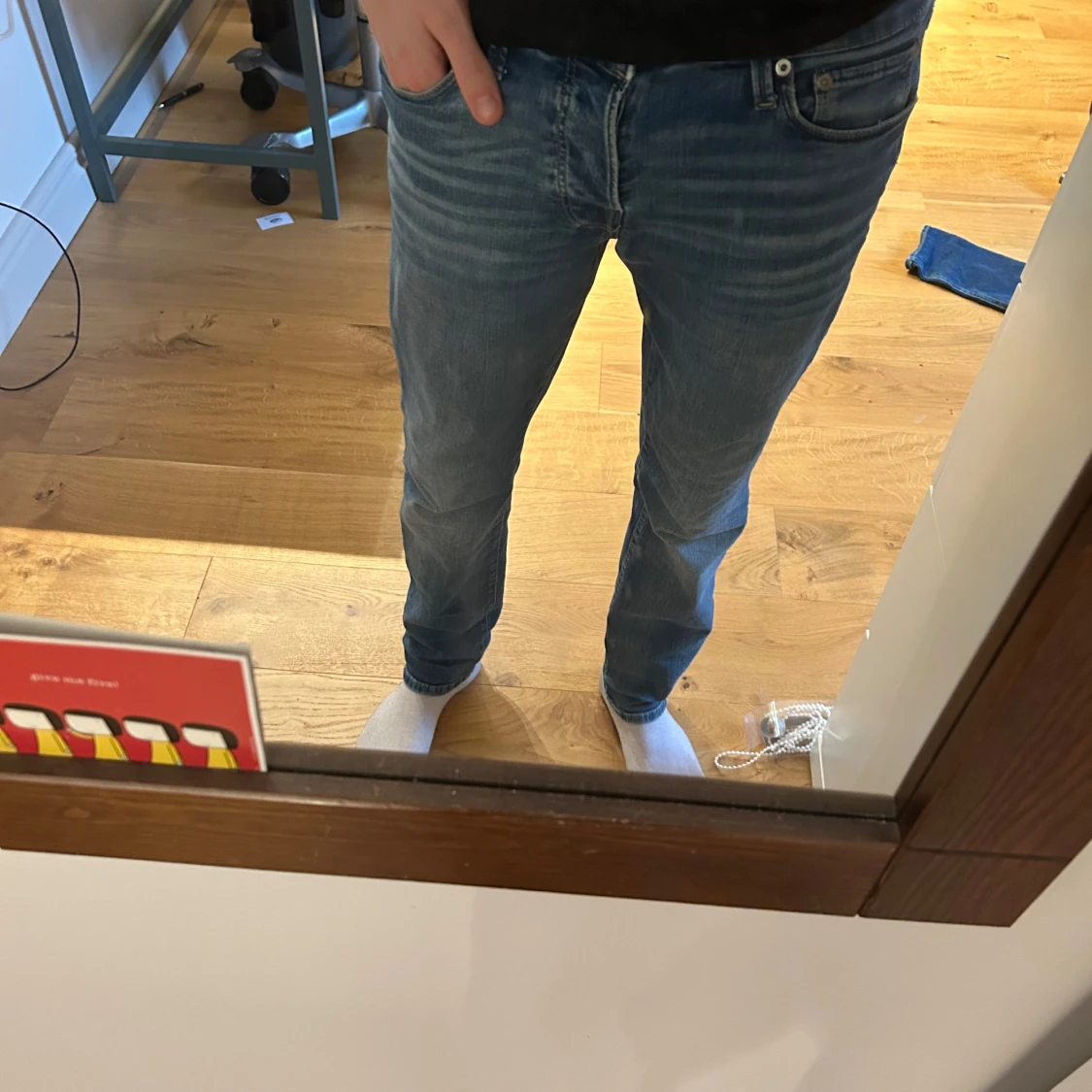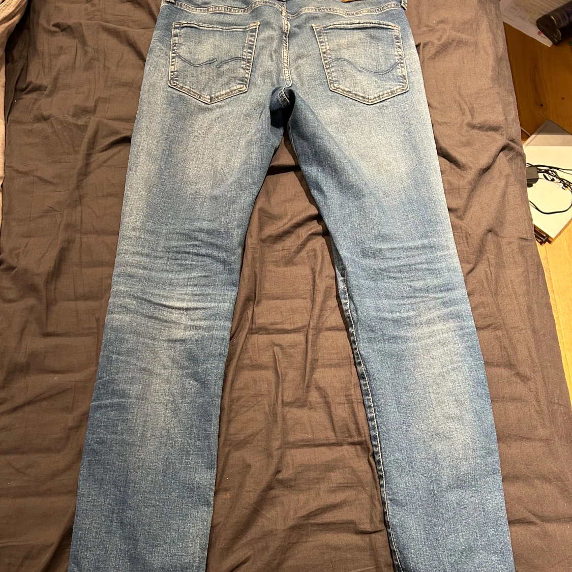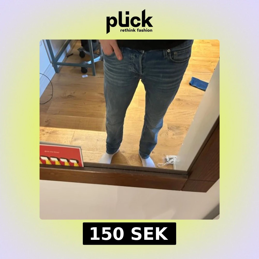 Säljer ett par klassiska blå jeans med slim passform. Byxorna har fem fickor, normal midja och stängs med dragkedja och knapp. Perfekta för en stilren vardagslook.