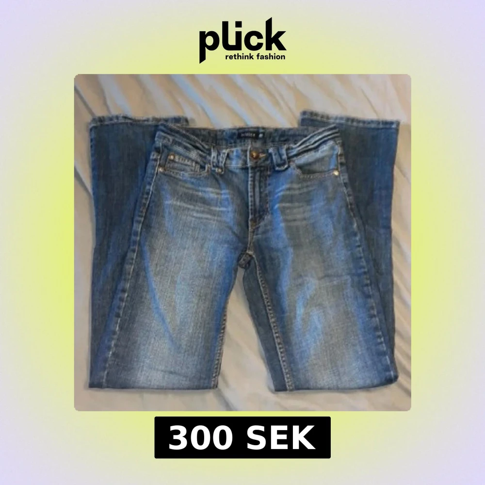 Säljer ett par klassiska blå jeansbyxor med en snygg tvätt och femficksdesign. Byxorna har en knappgylf och dekorativa sömmar på bakfickorna. Perfekta för en avslappnad stil.