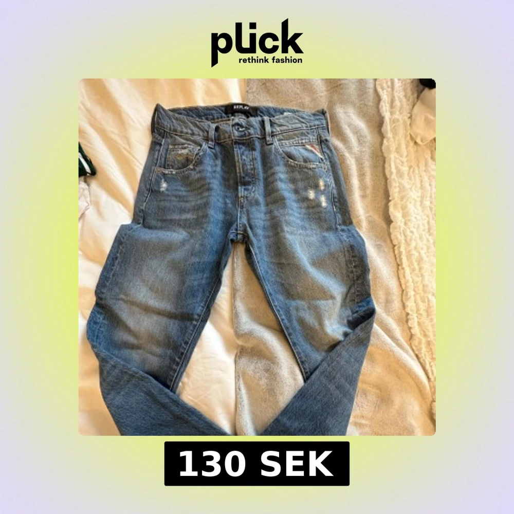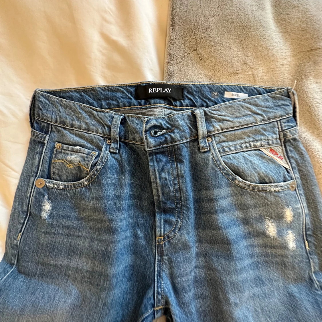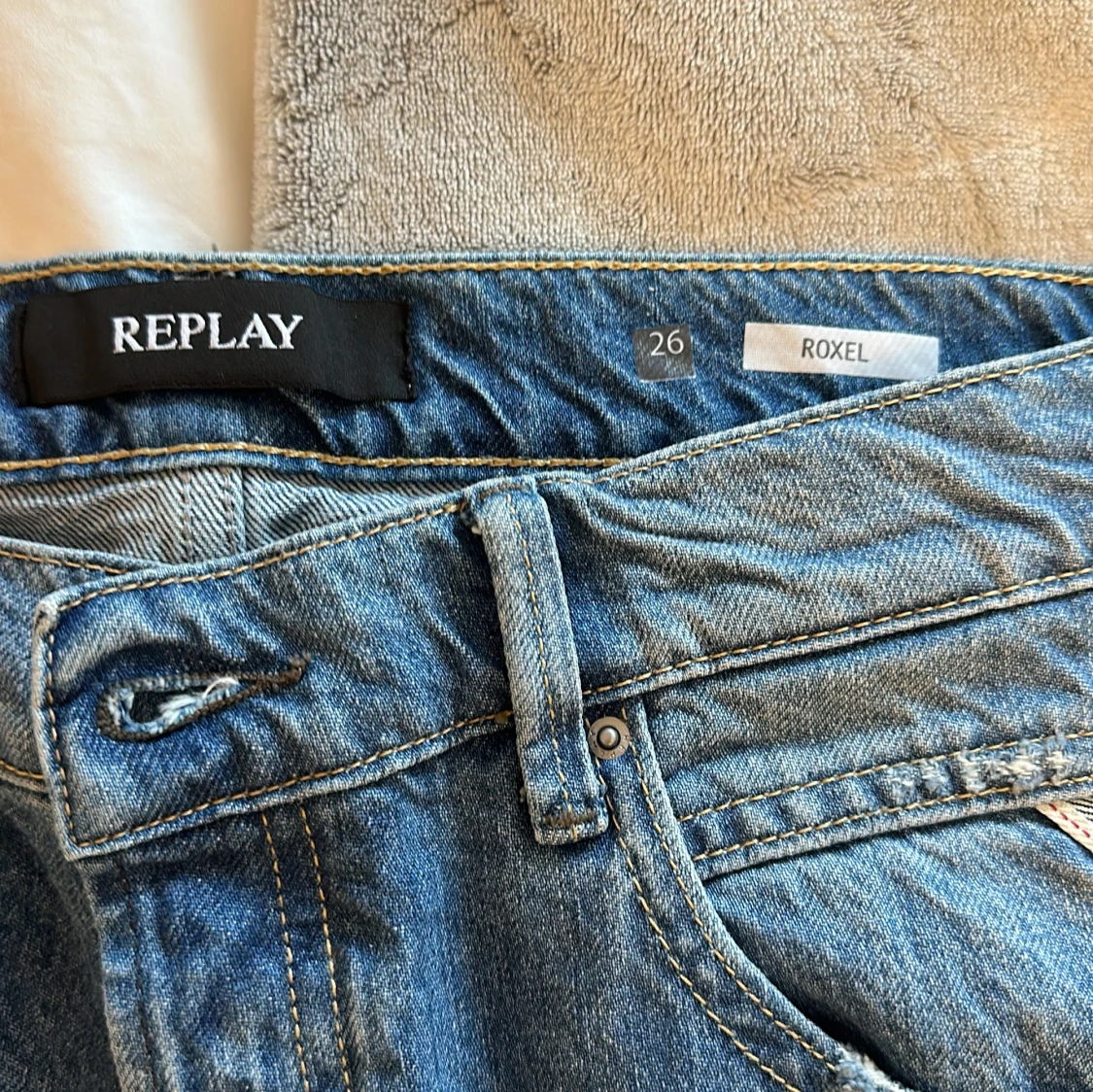 Säljer ett par klassiska blå jeansbyxor från Replay, modell Roxel. Byxorna har fem fickor, bälteshällor och slitna detaljer framtill för en trendig look. Perfekta till vardags och lätta att matcha med olika stilar.