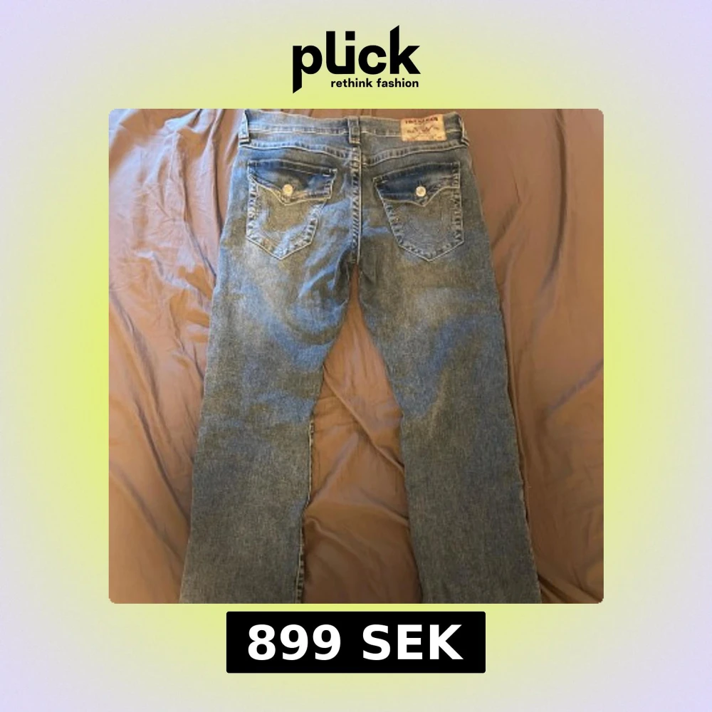 Säljer ett par klassiska blå jeans från True Religion, modell Ricky relaxed straight. Byxorna har raka ben, normal passform och ikoniska bakfickor med vita sömmar och knappar. Perfekta för dig som gillar en avslappnad stil.