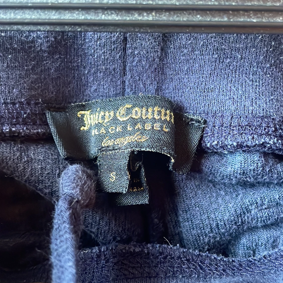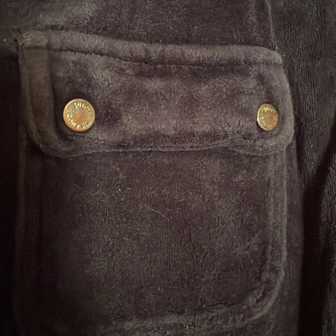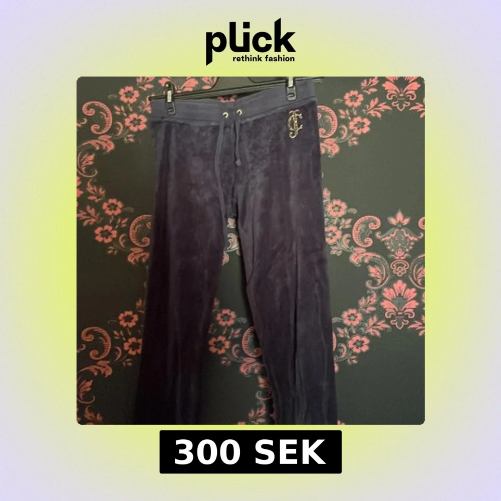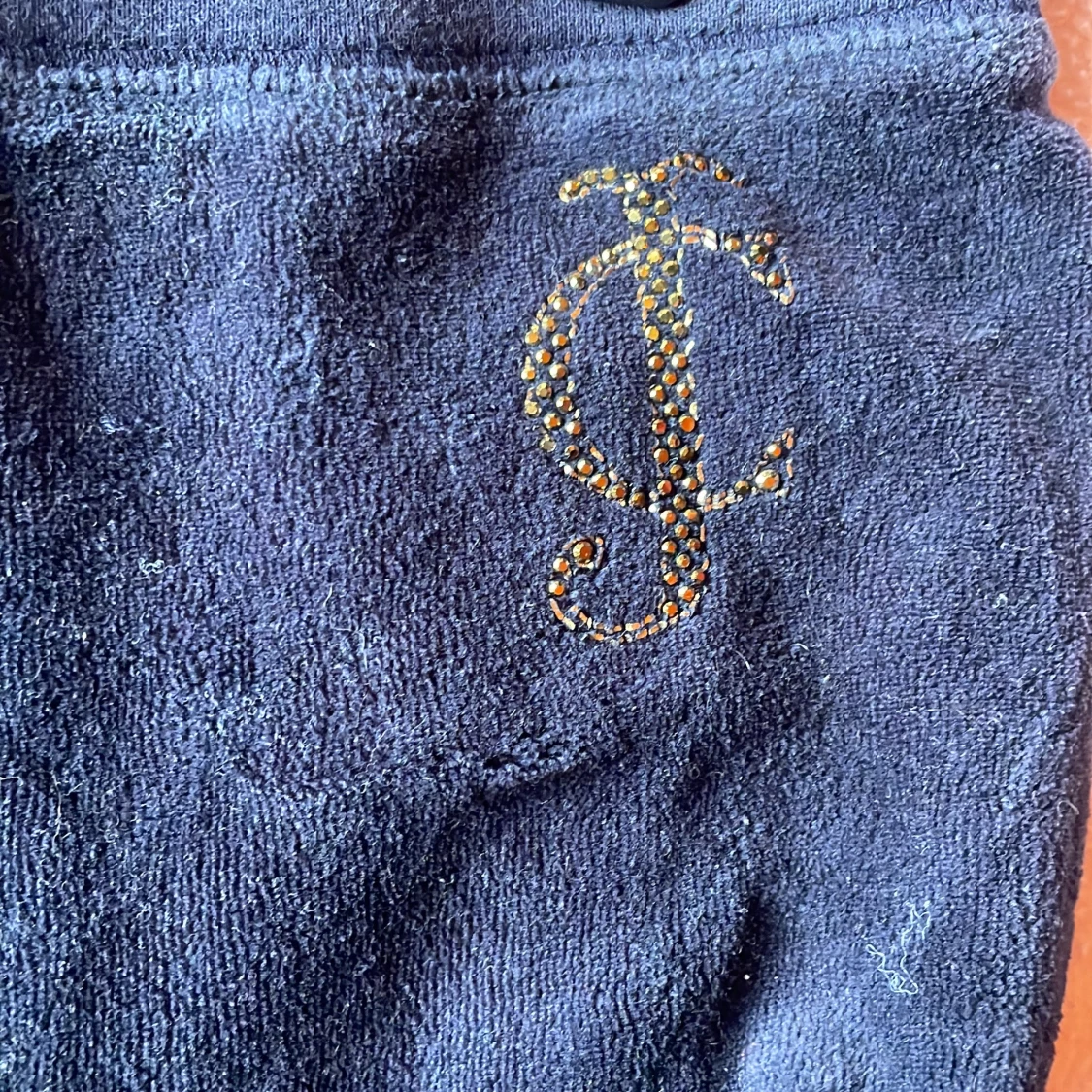 Snygga mörkblå mjukisbyxor från Juicy Couture med glittrande JC-logga på höger sida. Byxorna har en bekväm passform med snörning i midjan och fickor med knappar. Perfekta för en avslappnad stil. köpta på plick aldrig användna av mig. tecken på användning men inga defekter.