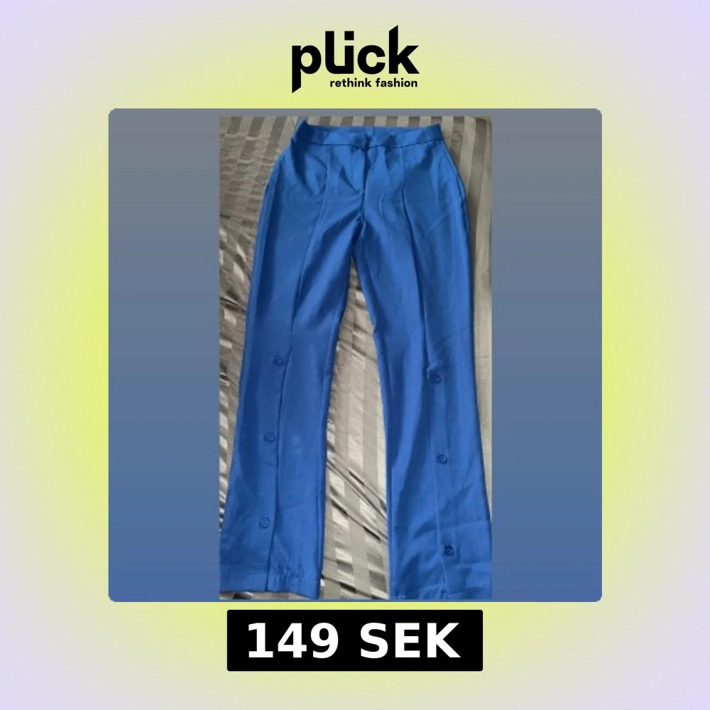 Snygga blå kostymbyxor med hög midja och raka ben. Byxorna har dekorativa knappar längs benen och en stilren design. Perfekta för en elegant look.