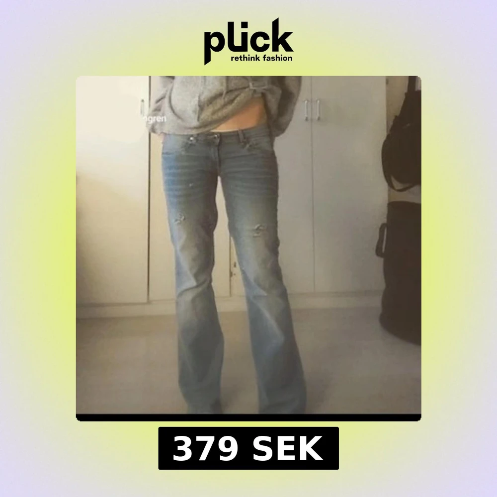 Snygga blå bootcut jeans med slitna detaljer på låren. De är väldigt lågmidjade då jag har sytt ner de till lågmidjade. Skulle säga att de är i storlek S/M. Jag säljer då de är lite för stora för mig. Jag är 1,65 lång och sitter bra i längden på mig. Skriv ifall ni har några frågor🩷