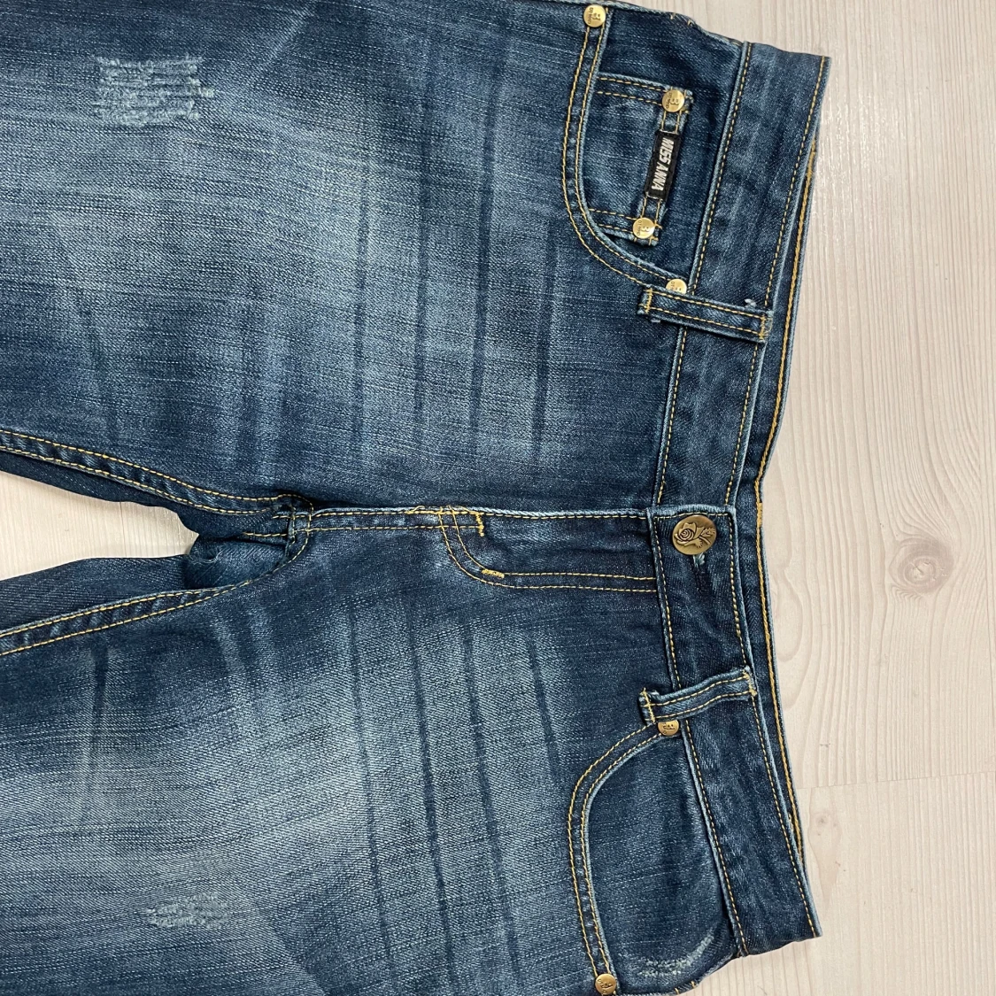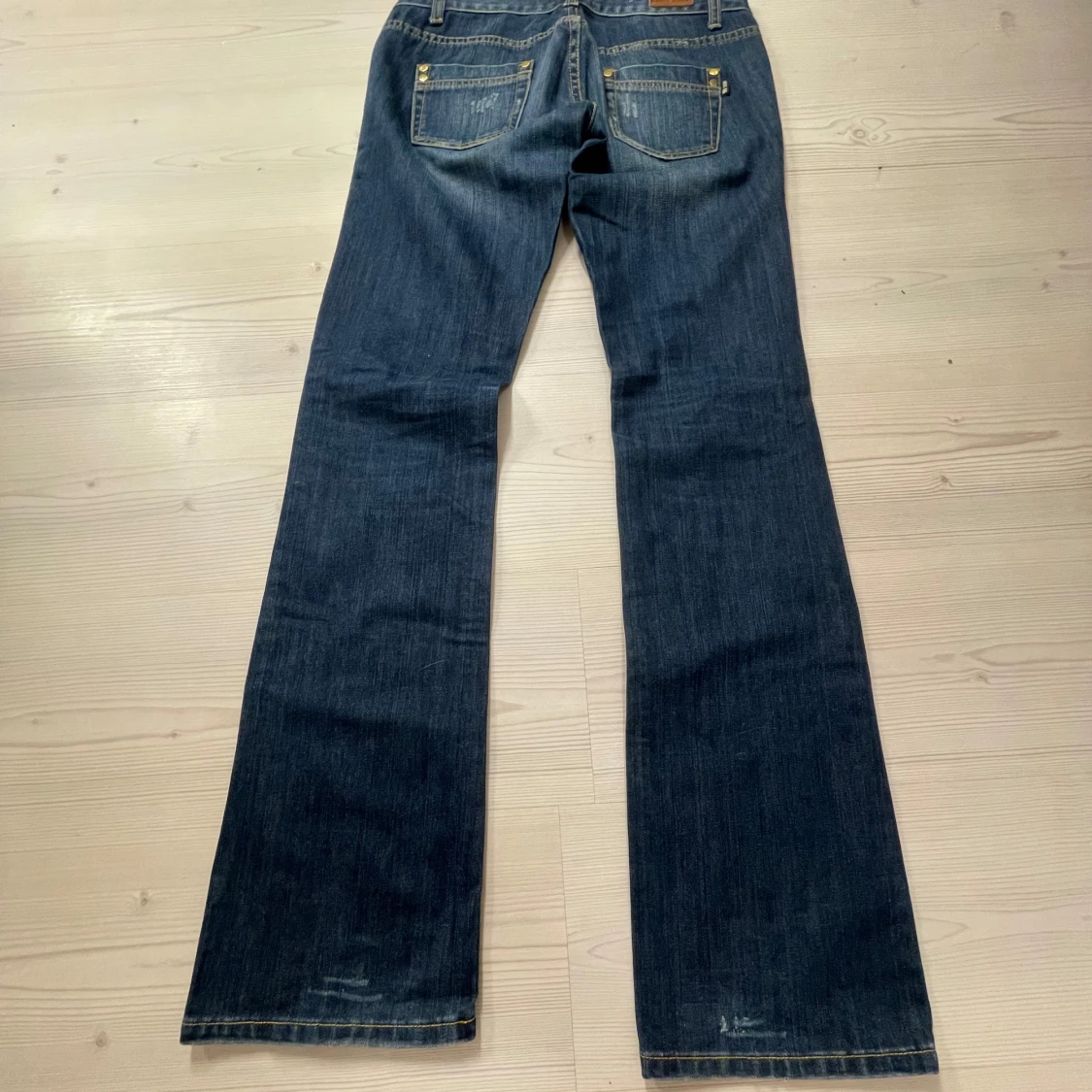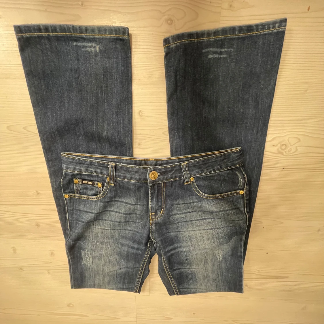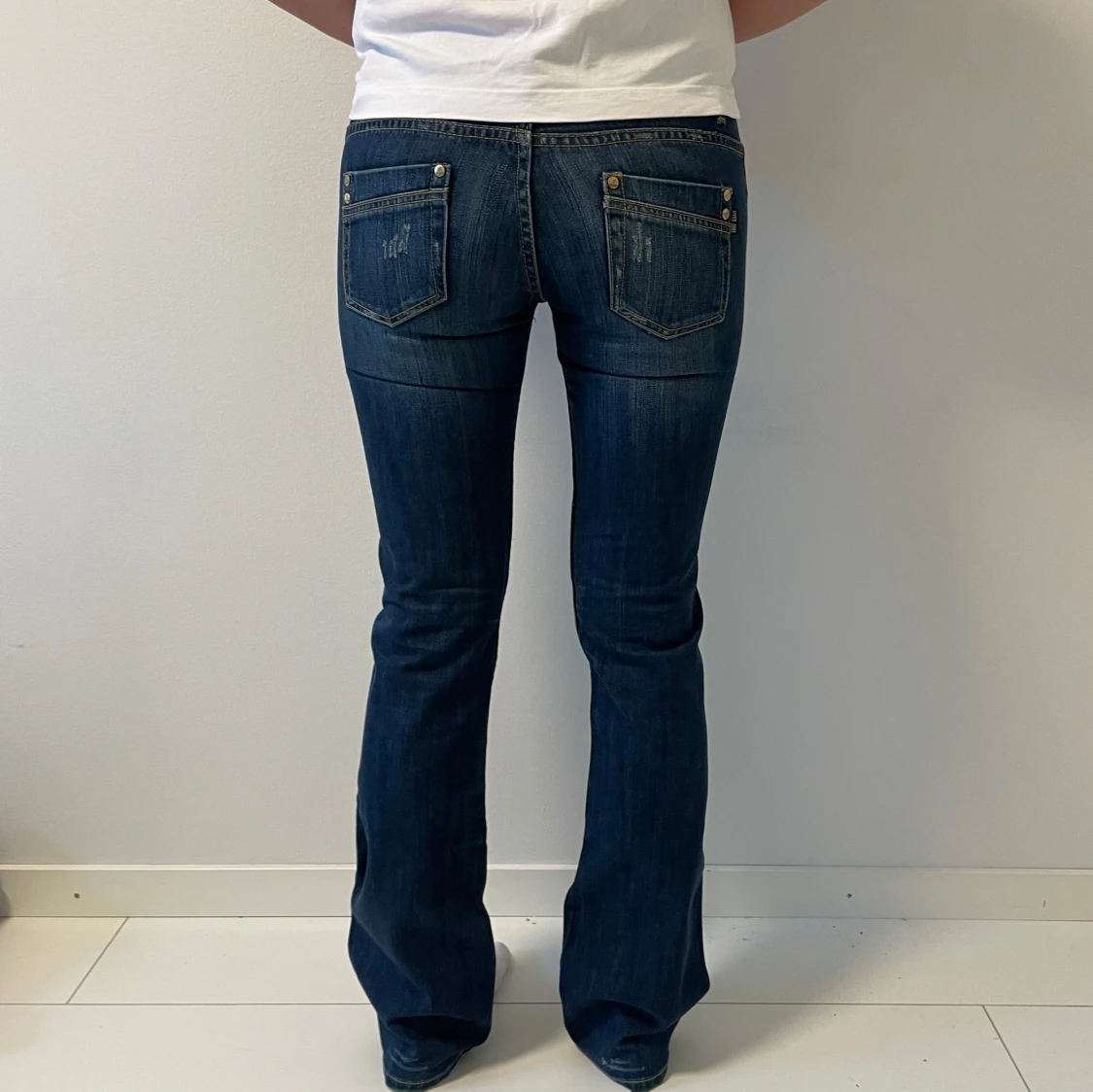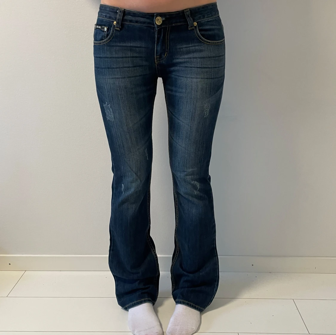 Snygga blå bootcut jeans från med slitna detaljer och klassisk femficksdesign. Midjemåttet 40, Innerbenslängd 83, Ytterbenslängd 104 och grenmått 19. Jag är 167💗