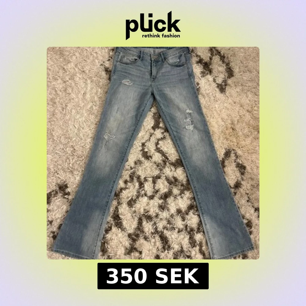 Snygga blå bootcut jeans med slitna detaljer på framsidan. De har en klassisk femficksdesign och en ljus tvätt som ger en avslappnad look. Perfekta för en trendig stil. W28 L33. Passar som storlek 34/36