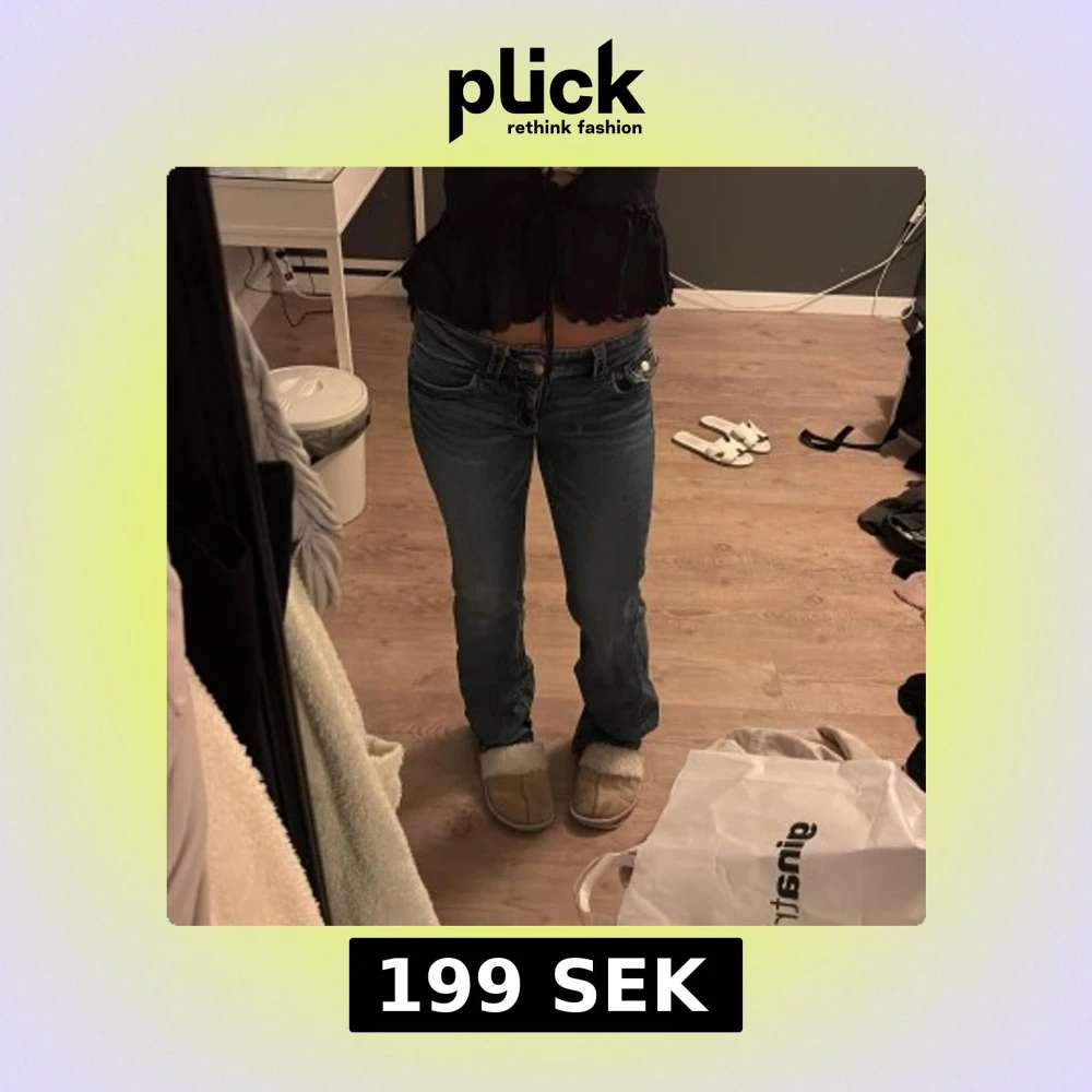 Säljer ett par blå jeans med låg midja och bootcut-snitt. Jeansen har klassiska fem fickor, snygga sömmar och en cool tvätt som ger dem en vintage vibe. Passformen är normal och materialet är slitstarkt denim. Perfekta för dig som gillar retrostilen och vill ha ett par jeans som sticker ut.