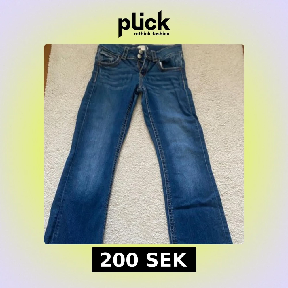 Snygga blå jeans från Gina Tricot med klassisk femficksdesign och dubbla knappar i midjan. Perfekta för en avslappnad stil med en skön passform. De har en lätt tvättad look som ger en trendig touch.