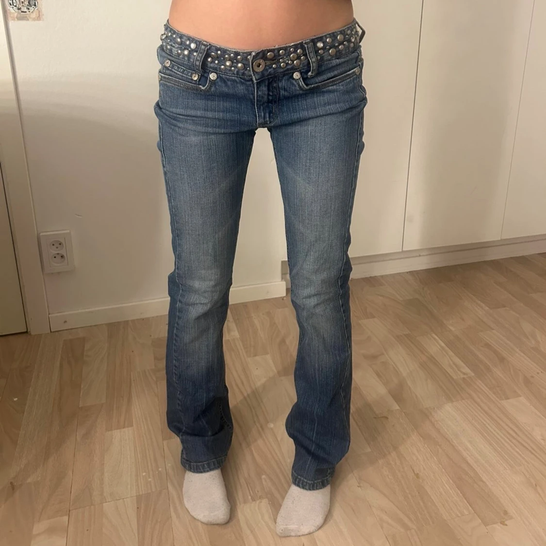 Kan diskutera pris!!, Snygga blå jeans med låg midja och bootcut passform. Jeansen har coola pärlor och pärldetaljer på både linning och bakfickor, samt klassisk femficksdesign. Perfekta för dig som vill sticka ut med en unik och trendig look.
